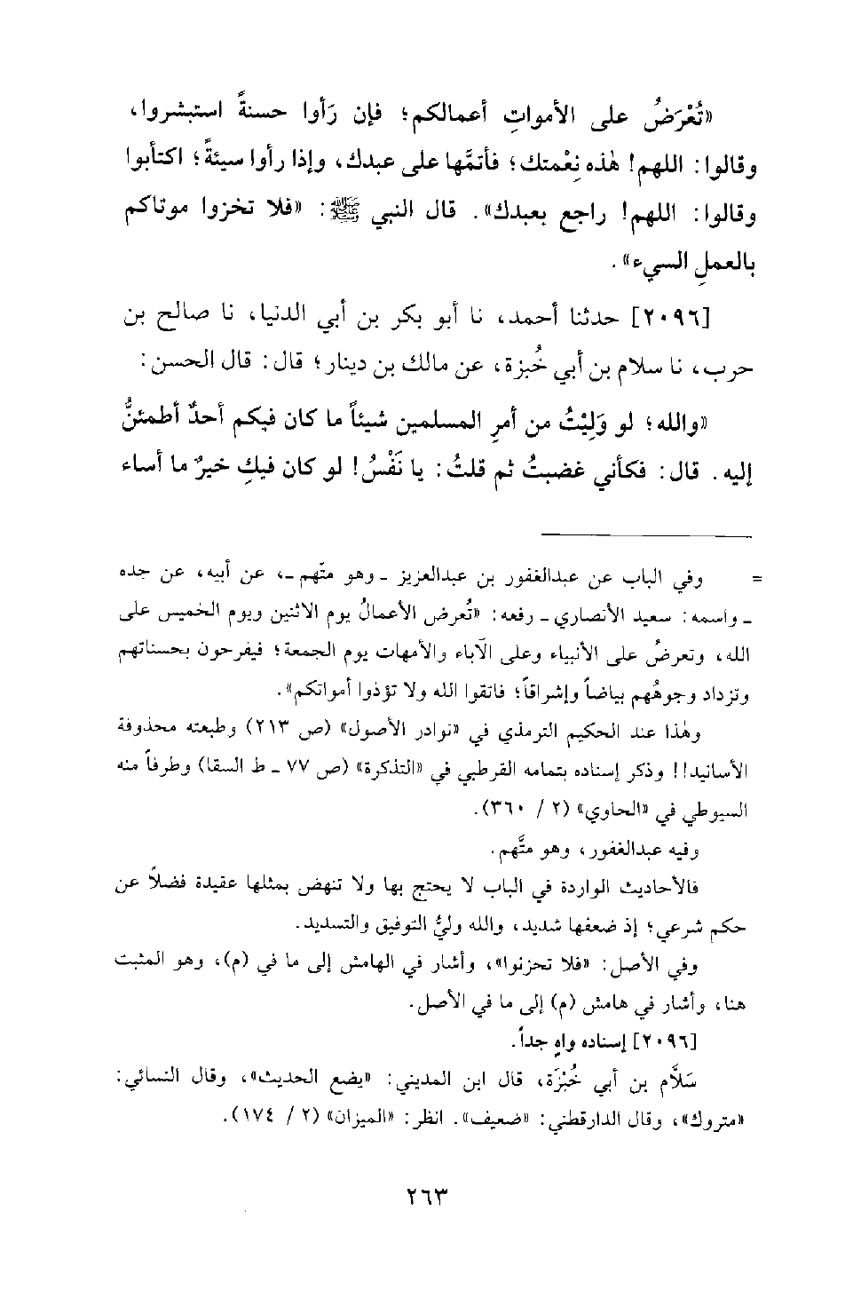 2096 - حَدَّثَنَا أَحْمَدُ، نَا أَبُو بَكْرِ بْنُ أَبِي الدُّنْيَا، نَا صَالِحُ بْنُ حَرْبٍ، نَا سَلامُ بْنُ أَبِي خُبْزَةَ، عَنْ مَالِكِ بْنِ دِينَارٍ؛ قَالَ: قَالَ الْحَسَنُ: وَاللهِ! لَوْ وَلِيتُ مِنْ أَمْرِ الْمُسْلِمِينَ شَيْئًا مَا كَانَ فِيكُمْ أَحَدٌ أَطْمَئِنُّ إِلَيْهِ. قَالَ: فَكَأَنِّي غَضِبْتُ، ثُمَّ قُلْتُ: يَا نَفْسُ! لَوْ كَانَ فِيكِ خَيْرٌ مَا أَسَاءَ -[264]- الْحَسَنُ بِكِ الظَّنَّ