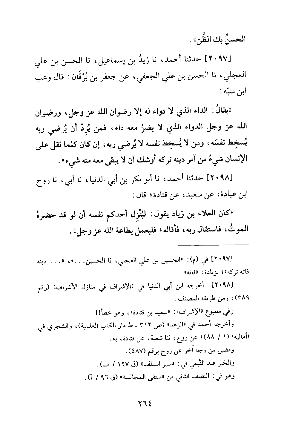 2097 - حَدَّثَنَا أَحْمَدُ، نَا زَيْدُ بْنُ إِسْمَاعِيلَ، نَا الْحَسَنُ بْنُ عَلِيٍّ الْعِجْلِيُّ، نَا الْحَسَنُ بْنُ عَلِيٍّ الْجُعْفِيُّ، عَنْ جَعْفَرِ بْنِ بُرْقَانَ: قَالَ وَهْبِ بْنُ مُنَبِّهٍ: يُقَالَ: الدَّاءُ الَّذِي لا دَوَاءَ لَهُ إِلا رِضْوَانَ اللهِ عَزَّ وَجَلَّ، وَرِضْوَانُ اللهِ عَزَّ وَجَلَّ الدَّوَاءَ الَّذِي لا يَضُرُّ مَعَهُ دَاءٌ، فَمَنْ يُرِدْ أَنْ يُرْضِي رَبَّهُ يُسْخِطْ نَفْسَهُ، وَمَنْ لا يُسْخِطْ نَفْسَهُ لا يُرْضِي رَبَّهُ، إِنْ كَانَ كُلَّمَا ثَقُلَ عَلَى الإِنْسَانِ شَيْءٌ مِنْ أَمْرِ دِينِهِ تَرَكَهُ؛ أَوْشَكَ أَنْ لا يَبْقَى مَعَهُ مِنْهُ شَيْءٌ.