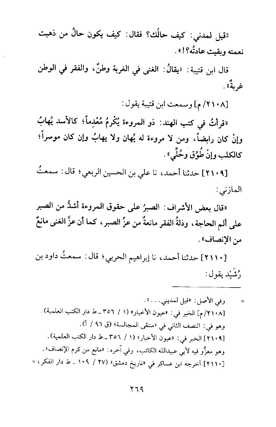 2109 - حَدَّثَنَا أَحْمَدُ، نَا عَلِيُّ بْنُ الْحُسَيْنِ الرَّبَعِيُّ؛ قَالَ: سَمِعْتُ الْمَازِنِيَّ: قَالَ بَعْضُ الأَشْرَافِ: الصَّبْرُ عَلَى حُقُوقِ الْمُرُوءَةِ أَشَدُّ مِنَ الصَّبْرِ عَلَى أَلَمِ الْحَاجَةِ، وَذِلَّةُ الْفَقْرِ مَانِعَةٌ مِنْ عِزِّ الصَّبْرِ، كَمَا أَنَّ عِزَّ الْغِنَى مَانِعٌ مِنَ الإِنْصَافِ.
