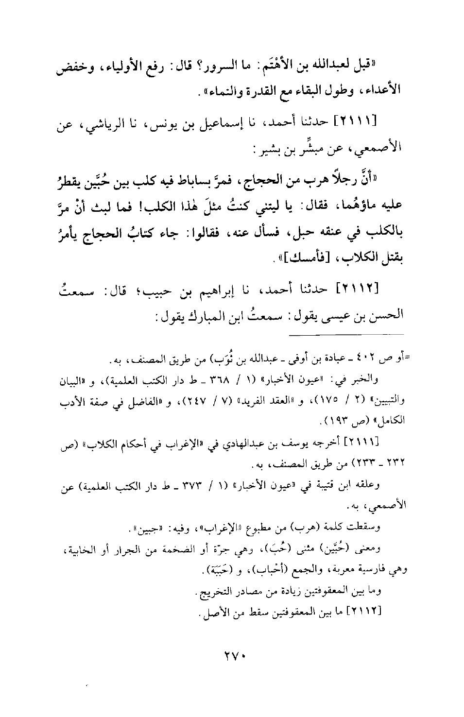 2111 - حَدَّثَنَا أَحْمَدُ، نَا إِسْمَاعِيلُ بْنُ يُونُسَ، نَا الرِّيَاشِيُّ، عَنِ الأَصْمَعِيِّ، عَنْ مُبَشِّرِ بْنِ بَشِيرٍ: أَنَّ رَجُلا هَرَبَ مِنَ الْحَجَّاجِ، فَمَرَّ بِسَابَاطٍ فِيهِ كَلْبٌ بَيْنَ حُبَّيْنِ يَقْطُرُ عَلَيْهِ مَاؤُهُمَا، فَقَالَ: يَا لَيْتَنِي كُنْتُ مِثْلَ هَذَا الْكَلْبِ! فَمَا لَبِثَ أَنْ مَرَّ بِالْكَلْبِ فِي عُنُقِهِ حَبْلٌ، فَسَأَلَ عَنْهُ، فَقَالُوا: جَاءَ كِتَابُ الْحَجَّاجِ يَأْمُرُ بِقَتْلِ الْكِلابِ، [فَأُمْسِكَ] .
