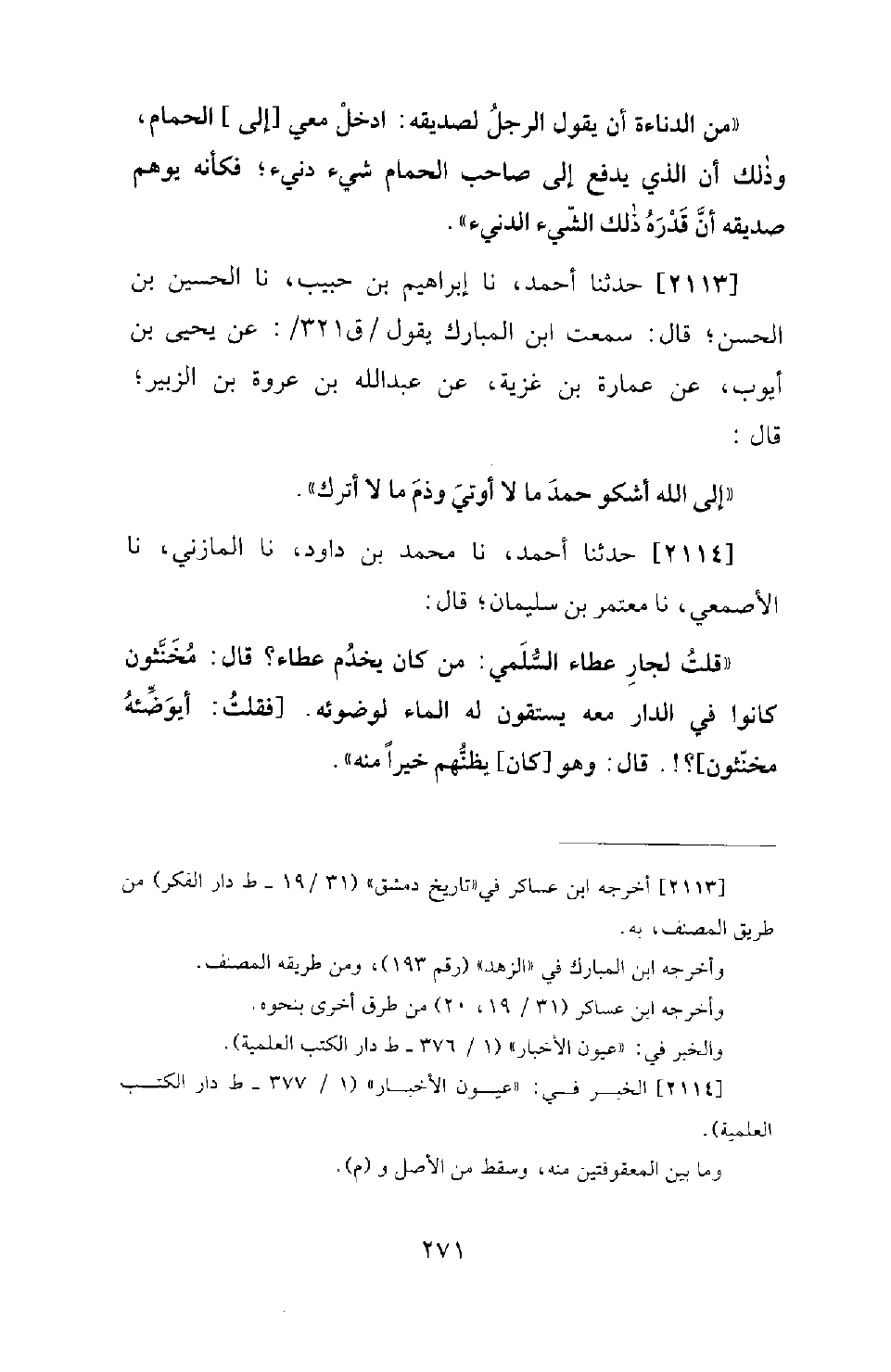 2114 - حَدَّثَنَا أَحْمَدُ، نَا مُحَمَّدُ بْنُ دَاوُدَ، نَا الْمَازِنِيُّ، نَا الأَصْمَعِيُّ، نَا مُعْتَمِرُ بْنُ سُلَيْمَانَ؛ قَالَ: قُلْتُ لِجَارِ عَطَاءِ السُّلَمِيِّ: مَنْ كَانَ يَخْدِمُ عَطَاءً؟ قَالَ: مُخَنَّثُونَ كَانُوا فِي الدَّارِ مَعَهُ يَسْتَقُونَ لَهُ الْمَاءَ لِوُضُوئِهِ. [فَقُلْتُ: أَيُوَضِّئُهُ مُخَنَّثُونَ] ؟ ! قَالَ: وَهُوَ [كَانَ] يَظُنُّهُمْ خَيْرًا مِنْهُ.