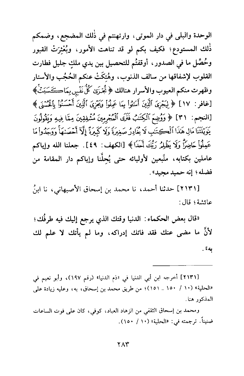 2131 - حَدَّثَنَا أَحْمَدُ، نَا مُحَمَّدُ بْنُ إِسْحَاقَ الأَصْبَهَانِيُّ، نَا ابْنُ عَائِشَةَ؛ قَالَ: قَالَ بَعْضُ الْحُكَمَاءِ: الدُّنْيَا وَقْتُكَ الَّذِي يَرْجِعُ إِلَيْكَ فِيهِ طَرْفُكَ؛ لأَنَّ مَا مَضَى عَنْكَ فَقَدْ فَاتَكَ إدراكه، وما لم يأت لا عِلْمَ لَكَ بِهِ.