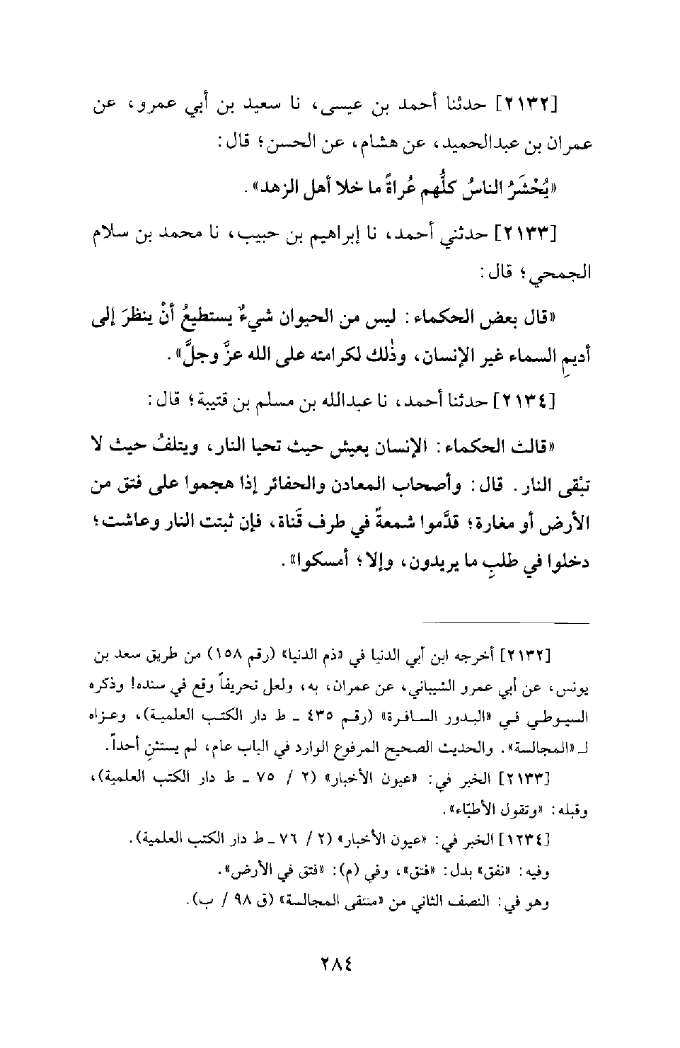 2132 - حَدَّثَنَا أَحْمَدُ بْنُ عِيسَى، نَا سَعِيدُ بْنُ أَبِي عَمْرٍو، عَنْ عِمْرَانَ بْنِ عَبْدِ الْحَمِيدِ، عَنْ هِشَامٍ، عَنِ الْحَسَنِ؛ قَالَ: يُحْشَرُ النَّاسُ كُلُّهُمْ عُرَاةً مَا خَلا أهل الزهد.