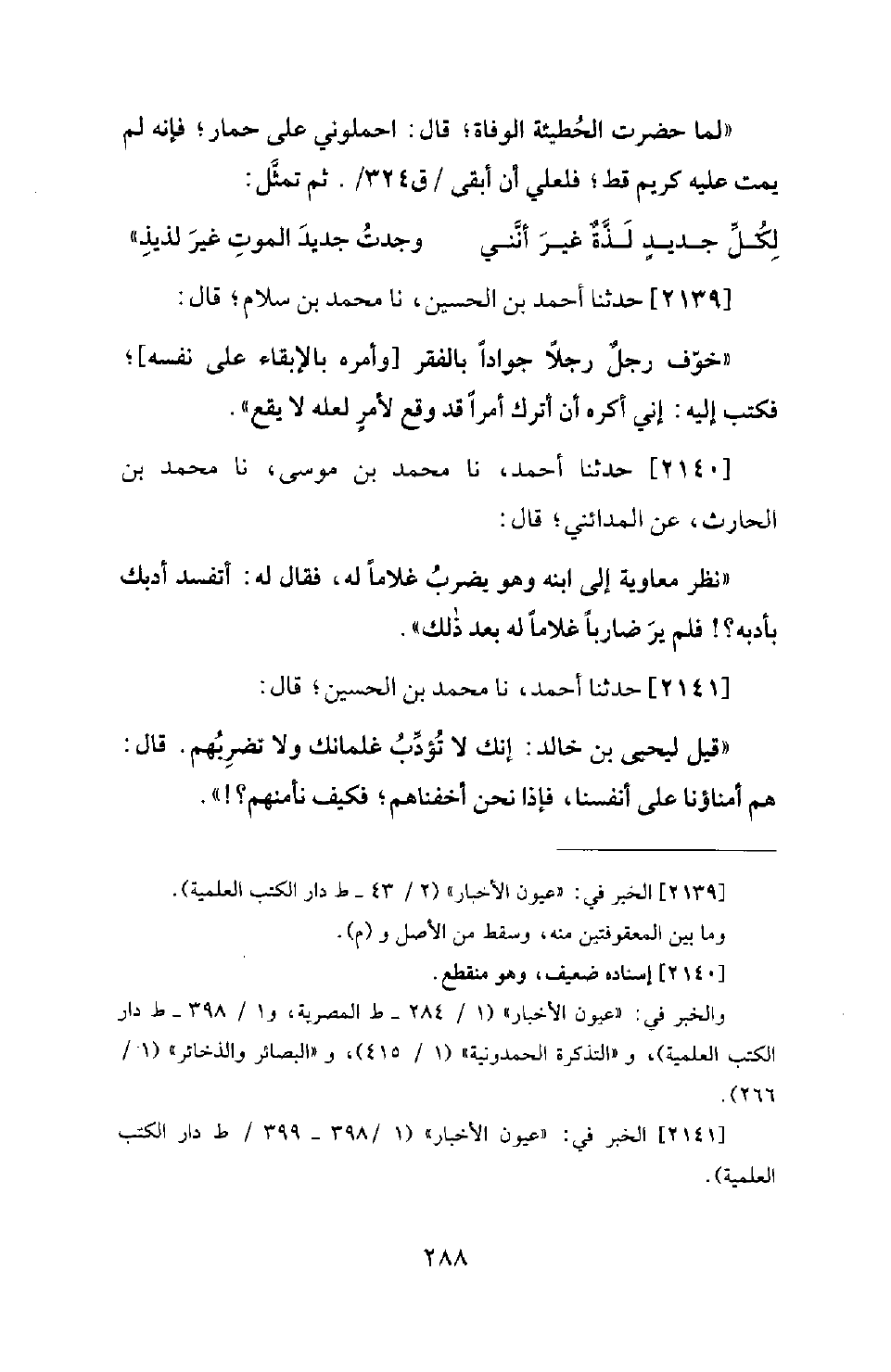 2140 - حَدَّثَنَا أَحْمَدُ، نَا مُحَمَّدُ بْنُ مُوسَى، نَا مُحَمَّدُ بْنُ الْحَارِثِ، عَنِ الْمَدَائِنِيِّ؛ قَالَ: نَظَرَ مُعَاوِيَةُ إِلَى ابْنِهِ وَهُوَ يَضْرِبُ غُلامًا لَهُ، فَقَالَ لَهُ: أَتُفْسِدُ أَدَبَكَ بِأَدَبِهِ؟ ! فَلَمْ يُرَ ضَارِبًا غُلامًا لَهُ بَعْدَ ذَلِكَ