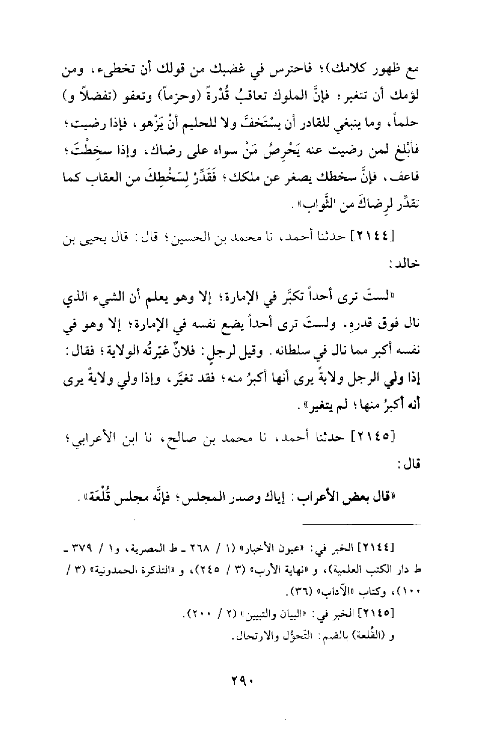 2144 - حَدَّثَنَا أَحْمَدُ، نَا مُحَمَّدُ بْنُ الْحُسَيْنِ؛ قَالَ: قَالَ يَحْيَى بْنُ خَالِدٍ: لَسْتَ تَرَى أَحَدًا تَكَبَّرَ فِي الإِمَارَةِ؛ إِلا وَهُوَ يَعْلَمُ أَنَّ الشَّيْءَ الَّذِي نَالَ فَوْقَ قَدْرِهِ، وَلَسْتَ تَرَى أَحَدًا يَضَعُ نَفْسَهُ فِي الإِمَارَةِ؛ إِلا وَهُوَ فِي نَفْسِهِ أَكْبَرُ مِمَّا نَالَ فِي سُلْطَانِهِ. وَقِيلَ لِرَجُلٍ: فُلانٌ غَيَّرَتْهُ الْوَلايَةُ؛ فَقَالَ: إِذَا وُلِّيَ الرَّجُلُ وَلايَةً يَرَى أَنَّهَا أَكْبَرُ مِنْهُ؛ فَقَدْ تَغَيَّرَ، وَإِذَا وُلِّيَ وَلايَةً يَرَى أَنَّهُ أَكْبَرُ مِنْهَا؛ لَمْ يَتَغَيَّرْ.