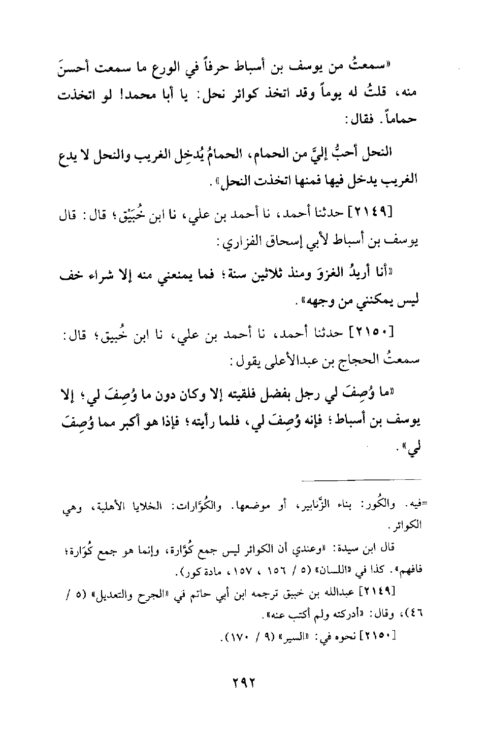 2149 - حَدَّثَنَا أَحْمَدُ، نَا أَحْمَدُ بْنُ عَلِيٍّ، نَا ابْنُ خُبَيْقٍ؛ قَالَ: قَالَ يُوسُفُ بْنُ أَسْبَاطٍ لِأَبِي إِسْحَاقَ الْفَزَارِيِّ: أَنَا أريد الغزو منذ ثَلاثِينَ سَنَةً؛ فَمَا يَمْنَعُنِي مِنْهُ إِلا شِرَاءُ خُفٍّ لَيْسَ يُمْكِنُنِي مِنْ وَجْهِهِ.