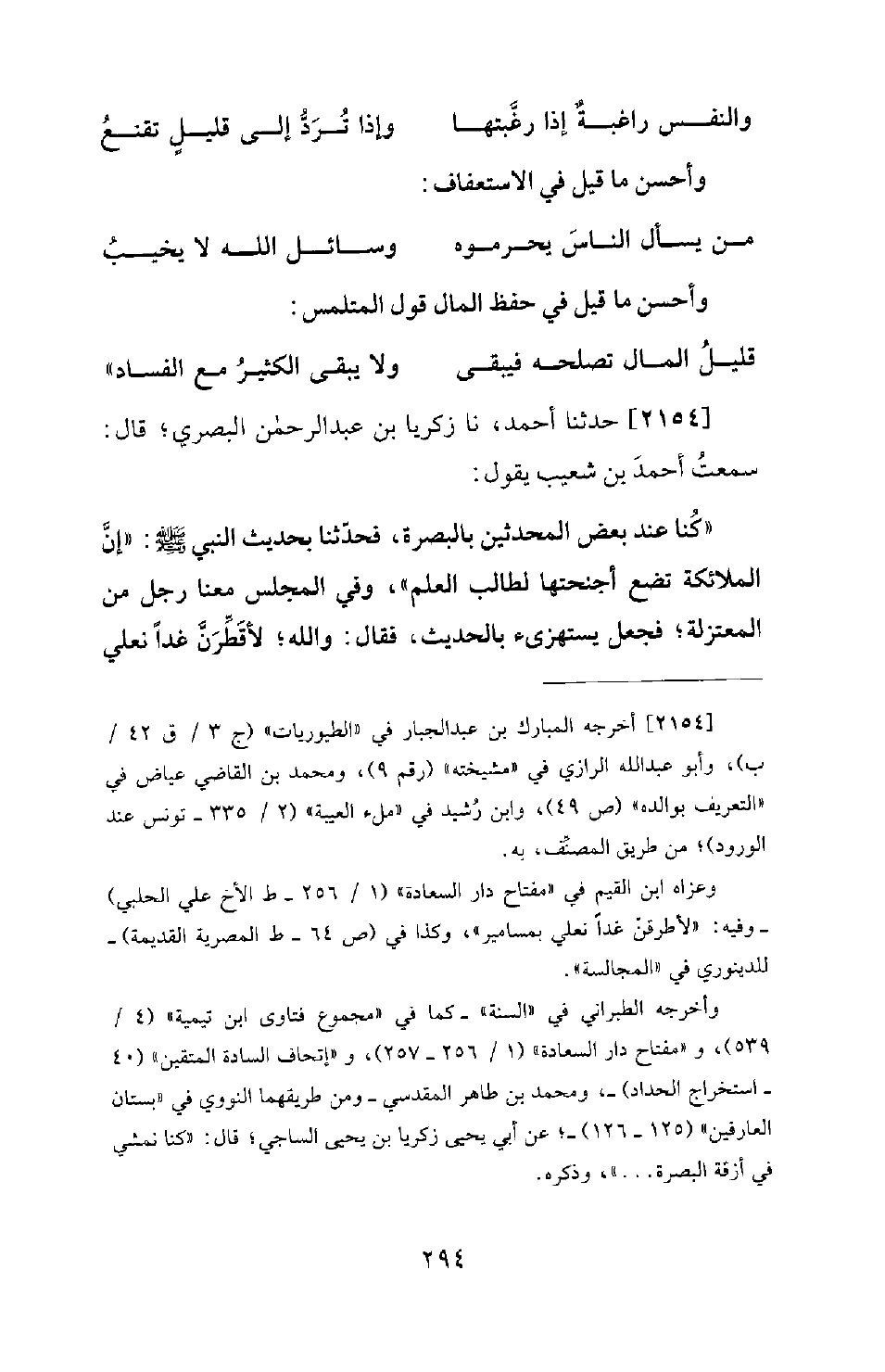 2154 - حَدَّثَنَا أَحْمَدُ، نَا زَكَرِيَّا بْنُ عَبْدِ الرَّحْمَنِ الْبَصْرِيُّ؛ قَالَ: سَمِعْتُ أَحْمَدَ بْنَ شُعَيْبٍ يَقُولُ: كُنَّا عِنْدَ بَعْضِ الْمُحَدِّثِينَ بِالْبَصْرَةِ، فَحَدَّثَنَا بِحَدِيثِ النَّبِيِّ صَلَّى اللَّهُ عَلَيْهِ وَسَلَّمَ: «إِنَّ الْمَلائِكَةِ تَضَعُ أَجْنِحَتَهَا لِطَالِبِ الْعِلْمِ» ، وَفِي الْمَجْلِسِ مَعَنَا رَجُلٌ مِنَ الْمُعْتَزِلَةِ؛ فَجَعَلَ يَسْتَهْزِئُ بِالْحَدِيثِ، فَقَالَ: وَاللهِ! لأَقَطِّرَنَّ غَدًا نَعْلِي -[295]- فَأَطَأُ بِهِمَا أَجْنِحَةَ الْمَلائِكَةِ. قَالَ: فَفَعَلَ وَمَشَى فِي النَّعْلَيْنِ، فَجَفَّتْ رِجْلاهُ جَمِيعًا، وَوَقَعَتْ فِي رِجْلَيْهِ جَمِيعًا الآكلة.