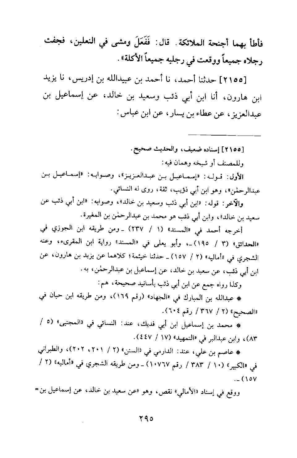 2155 - حَدَّثَنَا أَحْمَدُ، نَا أَحْمَدُ بْنُ عُبَيْدِ اللهِ بْنِ إِدْرِيسَ، نَا يَزِيدُ بْنُ هَارُونَ، أَنَا ابْنُ أَبِي ذِئْبٍ وَسَعِيدُ بْنُ خَالِدٍ، عَنْ إِسْمَاعِيلَ بْنِ عَبْدِ الْعَزِيزِ، عَنْ عَطَاءِ بْنِ يَسَارٍ، عَنِ ابْنِ عَبَّاسٍ: -[296]- أَنَّ رَسُولَ اللهِ صَلَّى اللَّهُ عَلَيْهِ وَسَلَّمَ خَرَجَ عَلَيْهِمْ، فَقَالَ: «أَلا أُنَبِّئُكُمْ بِخَيْرِ النَّاسِ مَنْزِلَةً؟» ، قَالُوا: بَلَى. فَقَالَ؛ «رَجُلٌ مُمْسِكٌ بِعِنَانِ فَرَسِهِ فِي سَبِيلِ اللهِ حَتَّى يَمُوتَ أَوْ يُقْتَلَ، أَلا أُنَبِّئُكُمْ بِالَّذِي يَلِيهِ؟» . قَالُوا: بَلَى. قَالَ: «امْرِؤٌ مُعْتَزِلٌ فِي شِعْبٍ مِنَ الشِّعَابِ يُقِيمُ الصَّلاةَ وَيُؤَدِّي الزَّكَاةَ وَيَعْتَزِلُ شُرُورَ النَّاسِ، أَلا أُنَبِّئُكُمْ بِشَرِّ النَّاسِ مَنْزِلَةً؟ الَّذِي يُسْأَلُ بِاللهِ وَلا يُعْطِي بِهِ»