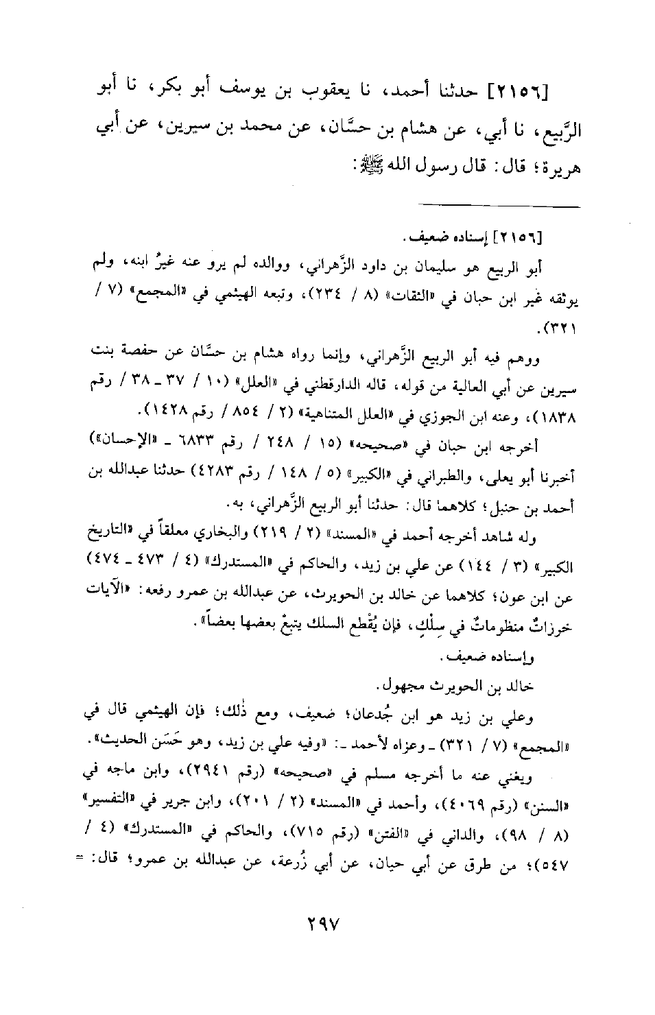 2156 - حَدَّثَنَا أَحْمَدُ، نَا يَعْقُوبُ بْنُ يُوسُفَ أَبُو بَكْرٍ، نَا أَبُو الرَّبِيعِ، نَا أَبِي، عَنْ هِشَامِ بْنِ حَسَّانَ، عَنْ مُحَمَّدِ بْنِ سِيرِينَ، عَنْ أَبِي هُرَيْرَةَ؛ قَالَ: قَالَ رَسُولُ اللهِ -[298]- صَلَّى اللَّهُ عَلَيْهِ وَسَلَّمَ: «خُرُوجُ الآيَاتِ بعضها عَلَى إِثْرِ بَعْضٍ يَتَتَابَعْنَ كَمَا تَتَتَابَعُ الْخَرَزُ فِي النِّظَامِ»