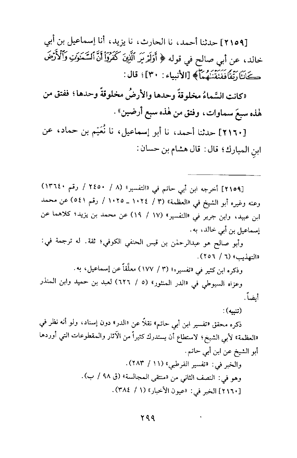2159 - حَدَّثَنَا أَحْمَدُ، نَا الْحَارِثُ، نَا يَزِيدُ، أَنَا إِسْمَاعِيلُ بْنُ أَبِي خَالِدٍ، عَنْ أَبِي صَالِحٍ فِي قَوْلِهِ: {أَوَلَمْ يَرَ الذين كفروا أن السماوات وَالأَرْضَ كَانَتَا رَتْقًا فَفَتَقْنَاهُمَا} [الأنبياء: 30] ؛ قَالَ: كَانَتِ السَّمَاءُ مَخْلُوقَةً وَحْدَهَا، وَالأَرْضُ مَخْلُوقَةً وَحْدَهَا؛ فَفَتَقَ مِنْ هَذِهِ سَبْعَ سماوات، وَفَتَقَ مِنْ هَذِهِ سَبْعَ أَرَضِينَ.