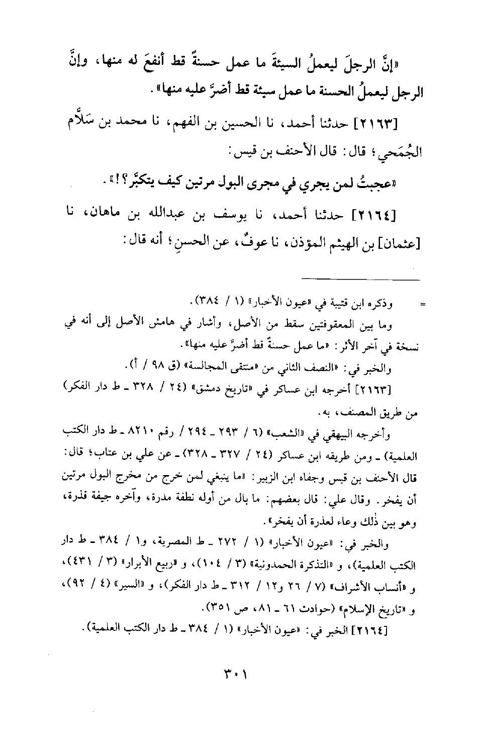 2163 - حَدَّثَنَا أَحْمَدُ، نَا الْحُسَيْنُ بْنُ الْفَهْمِ، نَا مُحَمَّدُ بْنُ سَلامٍ الْجُمَحِيُّ؛ قَالَ: قَالَ الأَحْنَفُ بْنُ قَيْسٍ: عَجِبْتُ لِمَنْ يَجْرِي فِي مَجْرَى الْبَوْلِ مَرَّتَيْنِ كَيْفَ يَتَكَبَّرُ؟ !
