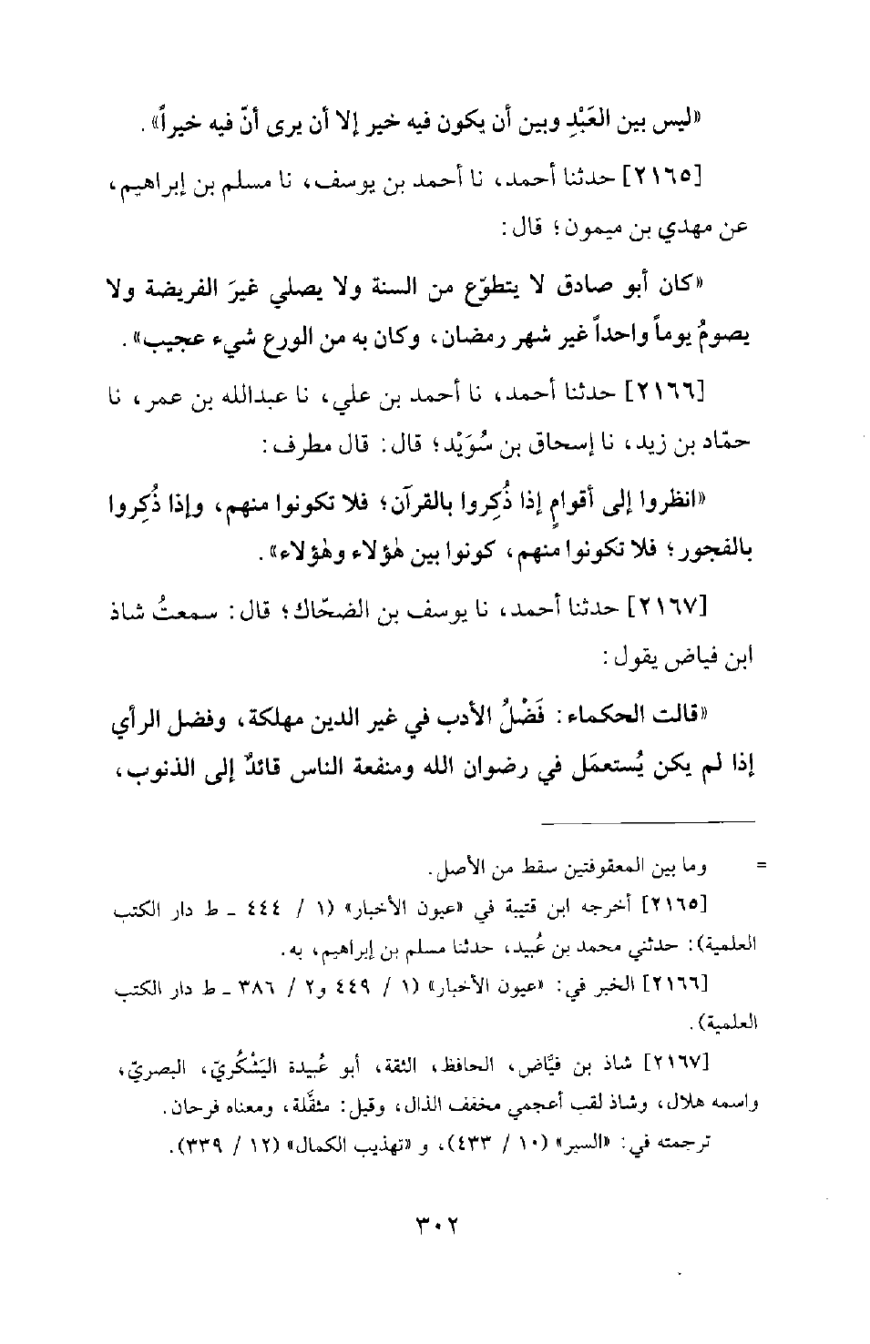 2167 - حَدَّثَنَا أَحْمَدُ، نَا يُوسُفُ بْنُ الضَّحَّاكِ؛ قَالَ: سَمِعْتُ شَاذَ بْنَ فَيَّاضٍ يَقُولُ: قَالَتِ الْحُكَمَاءُ: فَضْلُ الأَدَبِ فِي غَيْرِ الدِّينِ مَهْلَكَةٌ، وَفَضْلُ الرَّأْيِ إِذَا لَمْ يَكُنْ يُسْتَعْمَلُ فِي رِضْوَانِ اللهِ وَمَنْفَعَةِ النَّاسِ قَائِدٌ إِلَى الذُّنُوبِ، -[303]- وَالْحِفْظُ الزاكي الْوَاعِي بِغَيْرِ الْعَقْلِ مُضِرٌّ بِالْعَمَلِ الصَّالِحِ،وَالْعَمَلُ غَيْرُ الْوَرَعِ عَنِ الذُّنُوبِ خَازٍ الشَّيْطَانَ، وَإِفْرَاطُ الْعَقْلِ مُضِرٌّ بِالْجِدِّ.