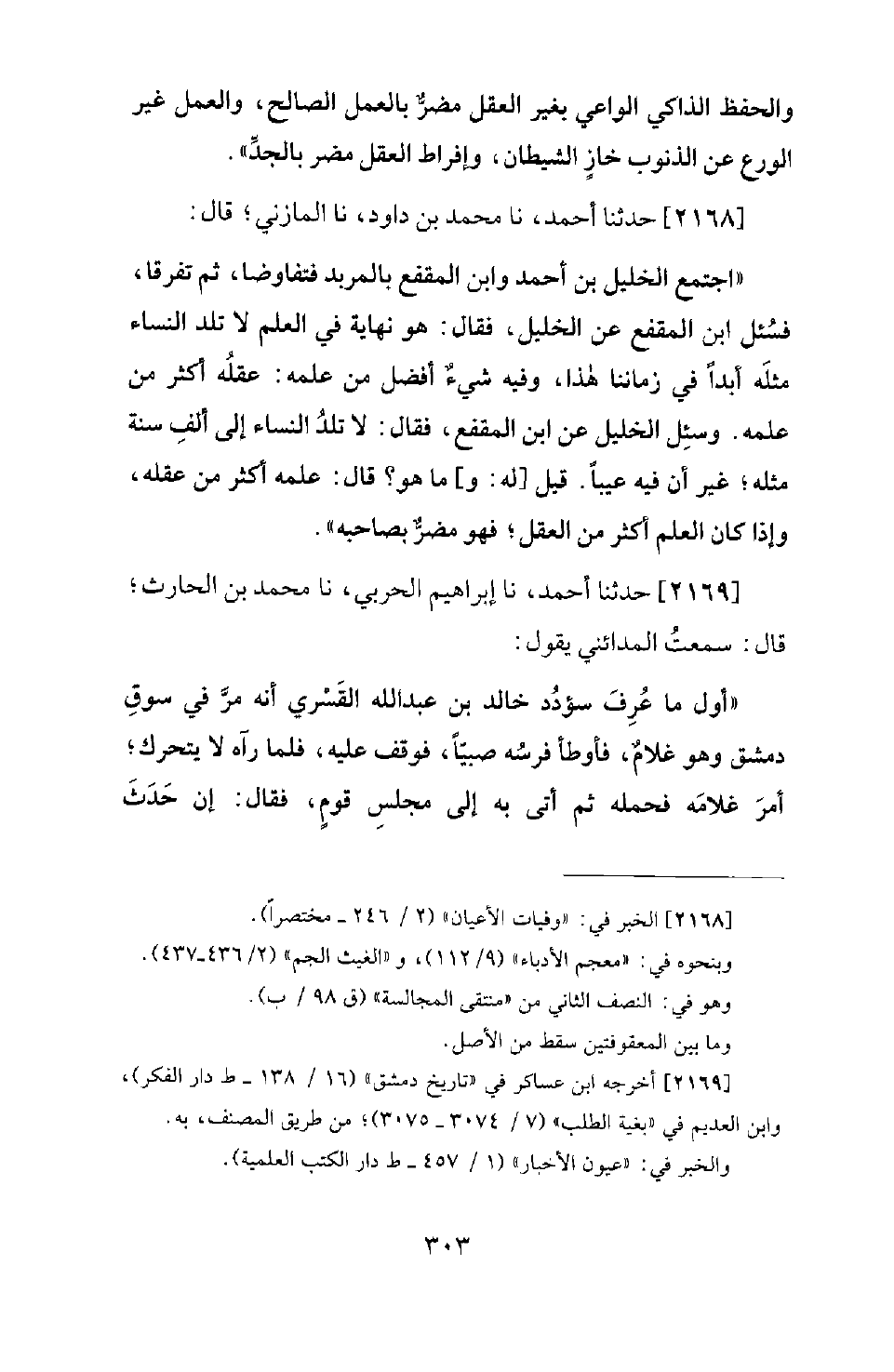 2168 - حَدَّثَنَا أَحْمَدُ، نَا مُحَمَّدُ بْنُ دَاوُدَ، نَا الْمَازِنِيُّ؛ قَالَ: اجْتَمَعَ الْخَلِيلُ بْنُ أَحْمَدَ وَابْنُ الْمُقَفَّعِ بِالْمِرْبَدِ فَتَفَاوَضَا، ثُمَّ تَفَرَّقَا، فَسُئِلَ ابْنُ الْمُقَفَّعِ عَنِ الْخَلِيلِ، فَقَالَ: هُوَ نِهَايَةٌ فِي الْعِلْمِ، لا تَلِدُ النِّسَاءُ مِثْلَهُ أَبَدًا فِي زَمَانِنَا هَذَا، وَفِيهِ شَيْءٌ أَفْضَلُ مِنْ عِلْمِهِ؛ عَقْلُهُ أَكْثَرُ مِنْ عِلْمِهِ. وَسُئِلَ الْخَلِيلُ عَنِ ابْنِ الْمُقَفَّعِ، فَقَالَ: لا تَلِدُ النِّسَاءُ إِلَى أَلْفِ سَنَةٍ مثْلَهُ؛ غَيْرَ أَنَّ فِيهِ عَيْبًا. قِيلَ لَهُ: وَمَا هُوَ؟ قَالَ: عِلْمُهُ أَكْثَرُ مِنْ عَقْلِهِ، وَإِذَا كَانَ الْعِلْمُ أَكْثَرَ مِنَ الْعَقْلِ؛ فَهُوَ مُضِرٌّ بِصَاحِبِهِ.