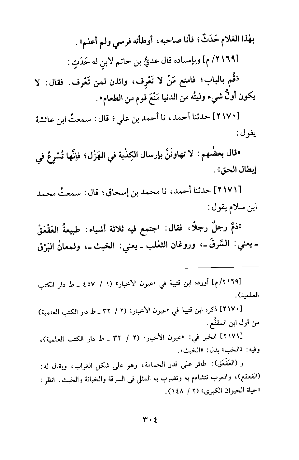 2171 - حَدَّثَنَا أَحْمَدُ، نَا مُحَمَّدُ بْنُ إِسْحَاقَ؛ قَالَ: سَمِعْتُ مُحَمَّدَ بْنَ سَلامٍ يَقُولُ: ذَمَّ رَجُلٌ رَجُلا، فَقَالَ: اجْتَمَعَ فِيهِ ثَلاثَةُ أَشْيَاءٍ: طَبِيعَةُ الْعَقْعَقِ - يَعْنِي: السَّرِقَ -، وَرَوَغَانَ الثَّعْلَبِ - يَعْنِي: الْخُبْثَ -، وَلَمَعَانَ الْبَرْقِ -[305]- يَعْنِي: الْكَذِبَ -.