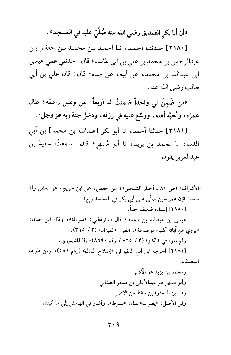 2180 - حَدَّثَنَا أَحْمَدُ، نَا أَحْمَدُ بْنُ مُحَمَّدِ بْنِ جَعْفَرِ بْنِ عَبْدِ الرَّحْمَنِ بْنِ مُحَمَّدِ بْنِ عَلِيِّ بْنِ أَبِي طَالِبٍ؛ قَالَ: حَدَّثَنِي عَمِّي عِيسَى بْنُ عَبْدِ اللهِ بْنِ مُحَمَّدٍ، عَنْ أَبِيهِ، عَنْ جَدِّهِ؛ قَالَ: قَالَ عَلِيُّ بْنُ أَبِي طَالِبٍ رَضِيَ اللهُ عَنْهُ: مَنْ ضَمِنَ لِي وَاحِدًا ضَمِنْتُ لَهُ أَرْبَعًا: مَنْ وَصَلَ رَحِمَهُ؛ طَالَ عُمْرُهُ، وَأَحَبَّهُ أَهْلُهُ، ووسع عليه رِزْقِهِ، وَدَخَلَ جَنَّةَ رَبِّهِ عَزَّ وَجَلَّ