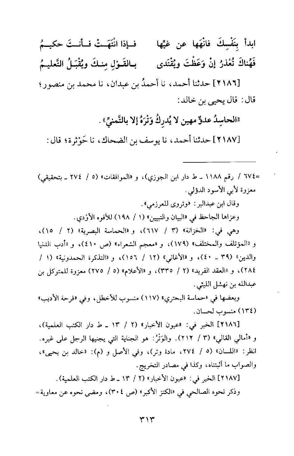 2186 - حَدَّثَنَا أَحْمَدُ، نَا أَحْمَدُ بْنُ عَبْدَانَ، نَا مُحَمَّدُ بْنُ مَنْصُورٍ؛ قَالَ: قَالَ يَحْيَى بْنُ خَالِدٍ: الْحَاسِدُ عَدُوٌّ مَهِينٌ لَا يُدْرِكُ وَتْرَهُ إِلَّا بِالتَّمَنِّي.