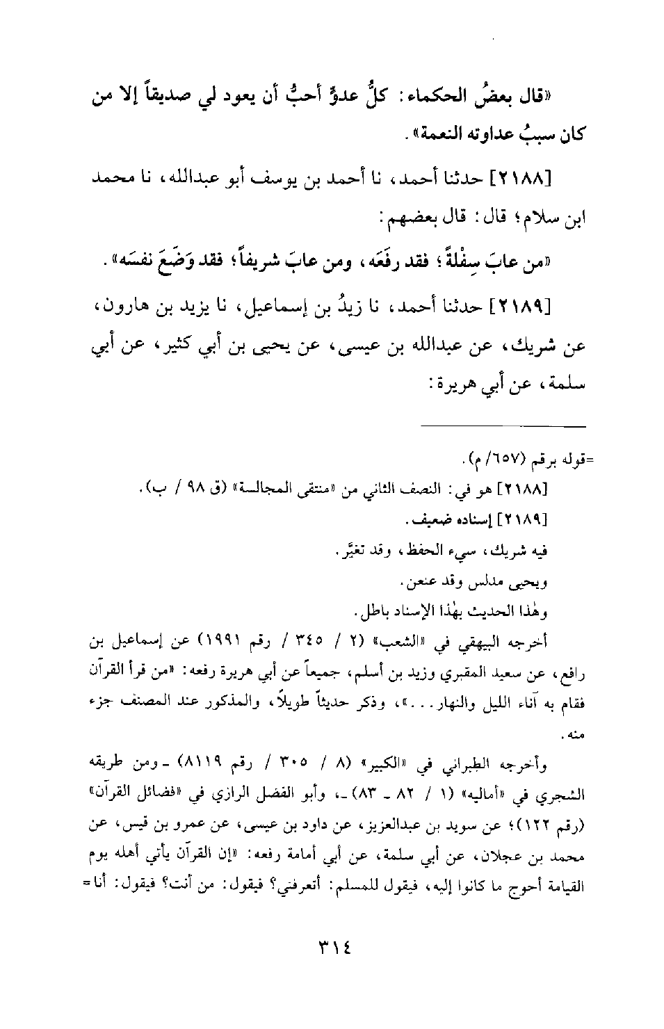 2188 - حَدَّثَنَا أَحْمَدُ، نَا أَحْمَدُ بْنُ يُوسُفَ أَبُو عَبْدِ اللهِ، نَا مُحَمَّدُ بْنُ سَلامٍ؛ قَالَ: قَالَ بَعْضُهُمْ: مَنْ عَابَ سِفْلَةً؛ فَقَدْ رَفَعَهُ، وَمَنْ عَابَ شَرِيفًا فَقَدْ وَضَعَ نَفْسَهُ.