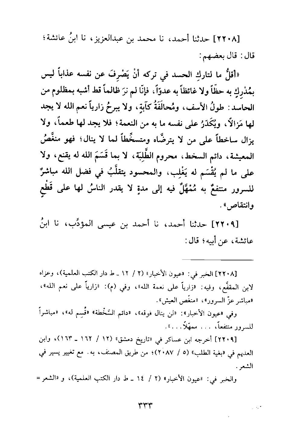 2208 - حَدَّثَنَا أَحْمَدُ، نَا مُحَمَّدُ بْنُ عَبْدِ الْعَزِيزِ، نَا ابْنُ عَائِشَةَ؛ قَالَ: قَالَ بَعْضُهُمْ: أَقَلُّ مَا لِتَارِكِ الْحَسَدِ فِي تَرْكِهِ أَنْ يَصْرِفَ عَنْ نَفْسِهِ عَذَابًا لَيْسَ بِمُدْرِكٍ بِهِ حَظًّا وَلَا غَائِظًا بِهِ عَدُوًّا، فَإِنَّا لَمْ نَرَ ظَالِمًا قَطُّ أَشْبَهُ بِمَظْلُومٍ مِنَ الْحَاسِدِ: طُولُ الْأَسَفِ، وَمُحَالَفَةُ كَآبَةٍ، وَلَا يَبْرَحُ زَارِيًا نِعَمَ اللهِ لَا يجد له مَزَالًا، وَيُكَدِّرُ عَلَى نَفْسِهِ مَا بِهِ مِنَ النِّعْمَةِ؛ فَلَا يَجِدُ لَهَا طَعْمًا، وَلَا يَزَالُ سَاخِطًا عَلَى مَنْ لَا يَتَرَضَّاهُ، وَمُتْسَخِّطًا لِمَا لَا يَنَالُ؛ فَهُوَ مُنَغَّصُ الْمَعِيشَةِ، دَائِمُ السَّخَطِ، مَحْرُومُ الطَّلِبَةِ، لَا بِمَا قَسَمَ اللهُ لَهُ يَقْنَعُ، وَلَا عَلَى مَا لَمْ يُقْسَمْ لَهُ يَغْلِبُ، وَالْمَحْسُودُ يَتَقَلَّبُ فِي فَضْلِ اللهِ، مُبَاشِرٌ لِلسُّرُورِ مُنْتَفِعٌ بِهِ، مُمَهَّلٌ فِيهِ إِلَى مُدَّةٍ لَا يَقْدِرُ النَّاسُ لَهَا عَلَى قَطْعٍ وَانْتِقَاصٍ.