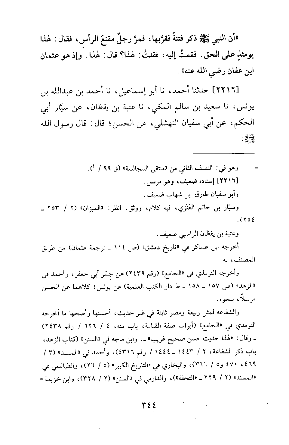 2216 - حَدَّثَنَا أَحْمَدُ، نَا أَبُو إِسْمَاعِيلَ، نَا أَحْمَدُ بْنُ عَبْدِ اللهِ بْنِ يُونُسَ، نَا سَعِيدُ بْنُ سَالِمٍ الْمَكِّيُّ، ناعتبة بْنُ يَقْظَانَ، عَنْ سَيَّارٍ أَبِي الْحَكَمِ، عَنْ أَبِي سُفْيَانَ النَّهْشَلِيِّ، عَنِ الْحَسَنِ؛ قَالَ: قَالَ رَسُولُ اللهِ -[346]- صَلَّى اللَّهُ عَلَيْهِ وَسَلَّمَ: «لَيَدْخُلَنَّ الْجَنَّةَ بِشَفَاعَةِ رَجُلٍ مِنْ أُمَّتِي عَدَدُ رَبِيعَةَ وَمُضَرَ» . قِيلَ: مَنْ هُوَ يَا رَسُولَ اللهِ؟ ! قَالَ: عُثْمَانُ بْنُ عَفَّانَ «