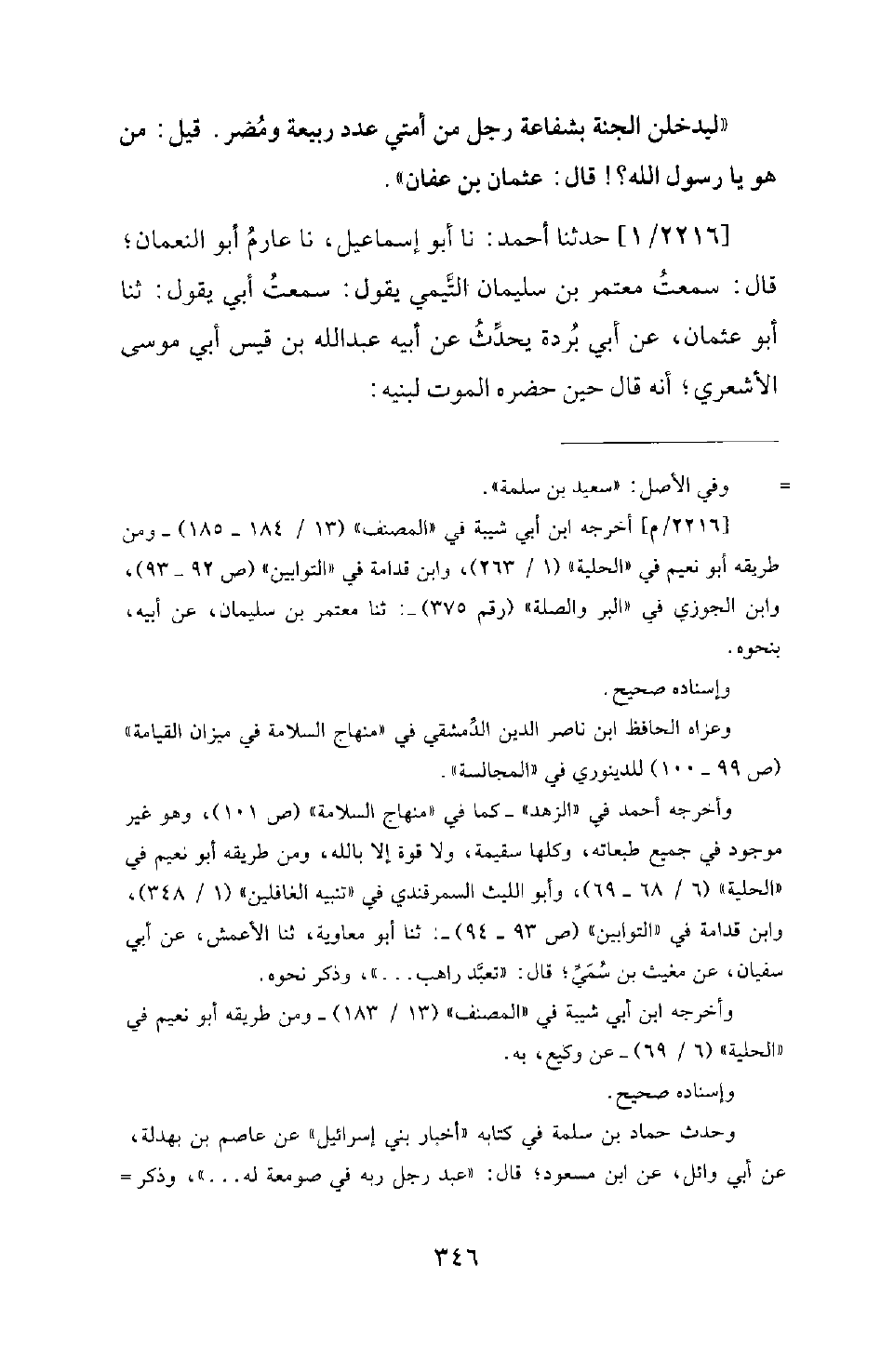 2216 - / 1 - حَدَّثَنَا أَحْمَدُ، نا أَبُو إِسْمَاعِيلَ، نا عَارِمُ أَبُو النُّعْمَانِ؛ قَالَ: سَمِعْتُ مُعْتَمِرَ بْنَ سُلَيْمَانَ التَّيْمِيَّ يَقُولُ: سَمِعْتُ أَبِي يَقُولُ: ثنا أَبُو عُثْمَانَ، عَنْ أَبِي بُرْدَةَ يُحَدِّثُ عَنْ أَبِيهِ عَبْدِ اللهِ بْنِ قَيْسٍ أَبِي مُوسَى الأَشْعَرِيِّ؛ أَنَّهُ قَالَ حِينَ حَضَرَهُ الْمَوْتُ لِبَنِيهِ: -[347]- أَيْ بَنِيَّ! اذْكُرُوا صَاحِبَ الرَّغِيفِ. ثُمَّ قَالَ: كَانَ رَجُلٌ فِي صَوْمَعَةٍ لَهُ يَتَعَبَّدُ - أُرَاهُ ذَكَرَ سَبْعِينَ سَنَةً، قَالَ عَفَّانُ: حَدَّثَنَا حَمَّادُ بْنُ سَلَمَةَ، عَنْ عَاصِمٍ؛ قَالَ: سِتِّينَ سَنَةً - لا يَنْزِلُ إِلَّا يَوْمًا وَاحِدًا فَإِنَّهُ نَزَلَ يَوْمًا وَاحِدًا. قَالَ: فَشَبَّ الشَّيْطَانُ فِي عَيْنِهِ امْرَأَةً أَوْ شَبَّةً، وَكَانَ مَعَ الْمَرْأَةِ سَبْعَ لَيَالٍ - أَوْ قَالَ: سَبْعَةَ أَيَّامٍ -، ثُمَّ كُشِفَ عَنِ الرَّجُلِ غِطَاؤُهُ، فَانْطَلَقَ تَائِبًا، -[348]- فَجَعَلَ كُلَّمَا خَطَا خُطْوَةً سَجَدَ وَصَلَّى، فَآوَاهُ اللَّيْلُ إِلَى دُكَّانٍ عَلَيْهِ اثْنَا عَشَرَ مِسْكِينًا مُنْضَجِعِيَنَ، فَأَدْرَكَهُ الْعَيَاءُ، فَأَلْقَى نَفْسَهُ بَيْنَ رَجُلَيْنِ مِنْهُمْ، وَكَانَ ثَمَّ رَاهِبٌ يَتَصَدَّقُ عَلَيْهِمْ كُلَّ لَيْلَةٍ، عَلَى كُلِّ مِسْكِينٍ بِرَغِيفٍ، فَجَاءَ الَّذِي يُعْطِيهِمْ، فَأَعْطَى كُلَّ وَاحِدٍ مِنْهُمْ رَغِيفًا، فَمَرَّ عَلَى الَّذِي أَلْقَى نَفْسَهُ بَيْنَ أَظْهُرِهِمْ فَأَعْطَاهُ رَغِيفًا، فَتَرَكَ أَحَدَهُمْ وَهُوَ لا يَشْعُرُ، فَقَالَ الْمَتْرُوكُ: مَا شَأْنُكَ لَمْ تُعْطِنِي؟ قَالَ: هَلْ أَعْطَيْتُ أَحَدًا مِنْكُمْ رَغِيفَيْنِ؟ قَالُوا: لا وَاللهِ. فَقَالَ: وَاللهِ! لَا أُعْطِيكَ اللَّيْلَةَ شَيْئًا - أَوْ كَمَا قَالَ -. فَذَكَرَ الرَّجُلَ فاعطاه الآخَرُ الرَّغِيفَ؛ فَأَصْبَحَ الرَّجُلُ مَيِّتًا، فَوُزِنَتِ السَّبْعُ لَيَالٍ بِالسَّبْعِينَ سَنَةً؛ فَرَجَحَتِ السَّبْعُ لَيَالٍ، ثُمَّ وُزِنَ الرَّغِيفُ بِالسَّبْعِ لَيَالٍ؛ فَرَجَحَ الرَّغِيفُ عَلَى السَّبْعِ لَيَالٍ. قَالَ أَبُو مُوسَى: فَأَيْ بَنِيَّ! أُذَكِّرُكُمْ صَاحِبَ الرَّغِيفِ