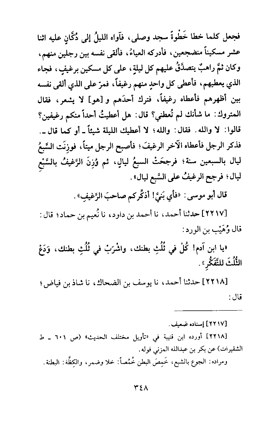 2217 - حَدَّثَنَا أَحْمَدُ، نا أَحْمَدُ بْنُ دَاوُدَ، نَا نُعَيْمُ بْنُ حَمَّادٍ؛ قَالَ: قَالَ وُهَيْبُ بْنُ الْوَرْدِ: يَا ابْنَ آدَمَ! كُلْ فِي ثُلُثِ بَطْنِكَ، وَاشْرَبْ فِي ثُلُثِ بَطْنِكَ، وَدَعِ الثُّلُثَ لِلتَّفَكُّرِ