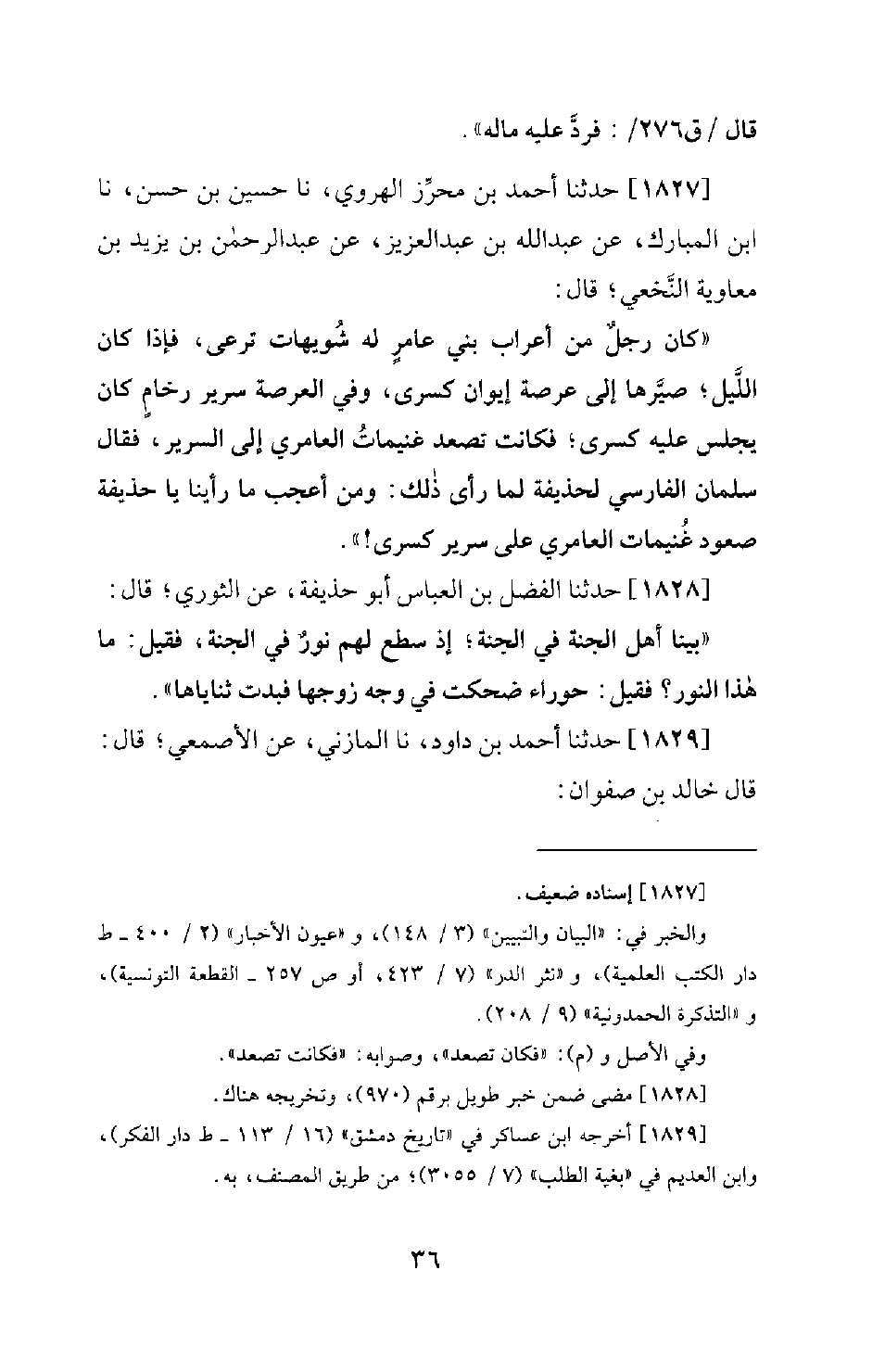 1827 - حَدَّثَنَا أَحْمَدُ بْنُ مُحَرِّزٍ الْهَرَوِيُّ نَا حُسَيْنُ بْنُ حَسَنٍ، نَا ابْنُ الْمُبَارَكِ، عَنْ عَبْدِ اللهِ بْنِ عَبْدِ الْعَزِيزِ، عَنْ عَبْدِ الرَّحْمَنِ بْنِ يَزِيدَ بْنِ مُعَاوِيَةَ النَّخَعِيِّ؛ قَالَ: كَانَ رَجُلٌ مِنْ أَعْرَابِ بَنِي عَامِرٍ لَهُ شُوَيْهَاتٍ تَرْعَى، فَإِذَا كَانَ اللَّيْلُ؛ صَيَّرَهَا إِلَى عَرْصَةِ إِيوَانِ كِسْرَى، وَفِي الْعَرْصَةِ سَرِيرُ رُخَامٍ كَانَ يَجْلِسُ عَلَيْهِ كِسْرَى؛ فَكَانَتْ تَصْعَدُ غُنَيْمَاتُ الْعَامِرِيِّ إِلَى السَّرِيرِ، فَقَالَ سَلْمَانُ الْفَارِسِيُّ لِحُذَيْفَةَ لَمَّا رَأَى ذَلِكَ: وَمِنْ أَعْجَبَ مَا رَأَيْنَا يَا حُذَيْفَةُ صُعُودَ غُنَيْمَاتِ الْعَامِرِيِّ عَلَى سَرِيرِ كِسْرَى!