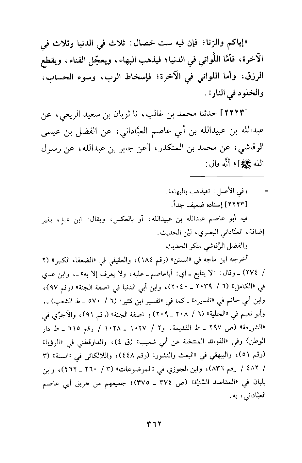 2223 - حَدَّثَنَا مُحَمَّدُ بْنُ غَالِبٍ، نَا ثَوْبَانُ بْنُ سَعِيدٍ الرِّبْعِيُّ، عَنْ عَبْدِ اللهِ بْنِ عُبَيْدِ اللهِ بْنِ أَبِي عَاصِمٍ الْعَبَّادَانِيِّ، عَنِ الْفَضْلِ بْنِ عِيسَى الرَّقَاشِيِّ، عَنْ مُحَمَّدِ بْنِ الْمُنْكَدِرِ، [عَنْ جَابِرِ بْنِ عَبْدِ اللهِ، عَنْ رَسُولِ اللهِ صَلَّى اللَّهُ عَلَيْهِ وَسَلَّمَ] ؛ أَنَّهُ قَالَ: -[363]- بَيْنَمَا أَهْلُ الْجَنَّةِ فِي نَعِيمِهِمْ؛ إِذْ سَطَعَ لَهُمْ نُورٌ، فرفعوا رؤوسهم؛ فَإِذَا الرَّبُّ تَعَالَى قَدْ أَشْرَفَ عَلَيْهِمْ، فَقَالَ لَهُمْ: السَّلامُ عَلَيْكُمْ يَا أَهْلَ الجنة، وذلك قَوْلِهِ تَعَالَى: (سَلامٌ قَوْلاً مِنْ رَّبٍ رَّحِيمٍ (58)) [يس: 58] ، قال: فيرفعون رؤوسهم، فَيَنْظُرُونَ إِلَيْهِ وَيَنْظُرُ إِلَيْهِمْ. قَالَ: وَيَحْتَجِبُ عَنْهُمْ؛ فَيَبْقَى نُورُهُ وَبَرَكَتُهُ عَلَيْهِمْ وَعَلَى دِيَارِهِمْ، ثُمَّ يَبْعَثُ إِلَيْهِمْ مُنَادِيًا فَيُنَادِيهِمْ بِصَوْتٍ يُسْمِعُهُمْ أَجْمَعِينَ، فَيَقُولُ: يَا أَهْلَ الْجَنَّةِ! يَا أَهْلَ الْمُلْكِ الدَّائِمِ وَالنَّعِيمِ الْمُقِيمِ وَالْحَيَاةِ الَّتِي لا مَوْتَ فِيهَا! إِنَّ رَبَّكُمْ لَيَقُولُ: أَرَضِيتُمْ عَنِّي؟ فَيَقُولُونَ: سُبْحَانَ رَبِّنَا! قَدْ رَضِينَا عَنْهُ الرِّضَا كُلَّهُ. فَيَقُولُ: يَا أَهْلَ الْجَنَّةِ! فَإِنَّ رَبَّكُمْ يَقُولُ: هَلْ لَكُمْ مِنْ حَاجَةٍ؟ فَيَقُولُونَ: سُبْحَانَ رَبِّنَا! قَدْ أَعْطَانَا حَوَائِجَنَا وَفَوْقَ حَوَائِجَنَا. فَيَقُولُ: يَا أَهْلَ الْجَنَّةِ! فَإِنَّ رَبَّكُمْ يَقُولُ: فَإِنِّي سَأُعْطِيكُمْ رِضْوَانِي، وَذَلِكَ قَوْلُهُ تَعَالَى: {وَرِضْوَانٌ مِنَ اللهِ أكبر} [التوبة: 72] ؛ فَتَتَعَاظَمُ الْجَنَّةُ، وَيَزْدَادُ كُلُّ شَيْءٍ فِيهَا أَضْعَافًا حُسْنًا «