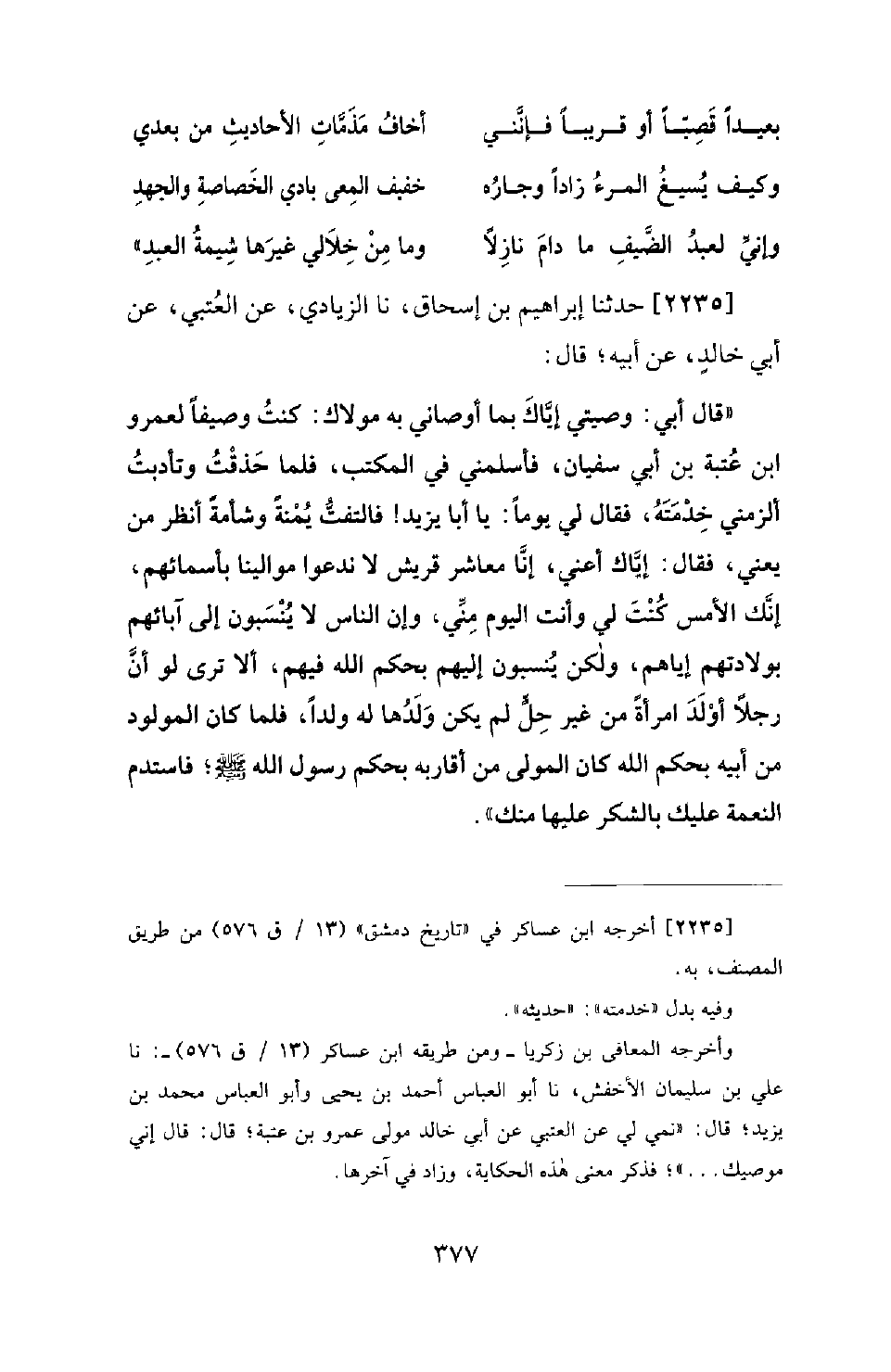 2235 - حَدَّثَنَا إِبْرَاهِيمُ بْنُ إِسْحَاقَ، نَا الزِّيَادِيُّ، عَنِ الْعُتْبِيِّ، عَنْ أَبِي خَالِدٍ، عَنْ أَبِيهِ، قَالَ: قَالَ أَبِي: وَصِيَّتِي إِيَّاكَ بِمَا أَوْصَانِي بِهِ مَوْلاكَ؛ كُنْتُ وَصِيفًا لِعَمْرِو بْنِ عُتْبَةَ بْنِ أَبِي سُفْيَانَ، فَأَسْلَمَنِي فِي الْمَكْتَبِ، فَلَمَّا حَذَقْتُ وَتَأَدَّبْتُ أَلْزَمَنِي خِدْمَتَهُ، فَقَالَ لِي يَوْمًا: يَا أَبَا يَزِيدَ! فَالْتَفَتُّ يُمْنَةً وَشَأْمَةً أَنْظُرُ مِنْ يَعْنِي، فَقَالَ: إِيَّاكَ أَعْنِي، إِنَّا معاشر قريش لا ندعوا مَوَالِينَا بِأَسْمَائِهِمْ، إِنَّكَ الأَمْسَ كُنْتَ لِي وَأَنْتَ الْيَوْمَ مِنِّي، وَإِنَّ النَّاسَ لا يُنْسَبُونَ إِلَى آبَائِهِمْ بِوِلادَتِهِمْ إِيَّاهُمْ، وَلَكِنْ يُنْسَبُونَ إِلَيْهِمْ بِحُكْمِ اللهِ فِيهِمْ، أَلا تَرَى لَوْ أَنَّ رَجُلًا أَوْلَدَ امْرَأَةً مِنْ غَيْرِ حِلٍّ لَمْ يَكُنْ وَلَدُهَا لَهُ وَلَدًا، فَلَمَّا كَانَ الْمَوْلُودُ مِنْ أَبِيهِ بِحُكْمِ اللهِ كَانَ الْمَوْلَى مِنْ أَقَارِبِهِ بِحُكْمِ رَسُولِ اللهِ صَلَّى اللَّهُ عَلَيْهِ وَسَلَّمَ؛ فَاسْتَدِمِ النِّعْمَةَ عَلَيْكَ بِالشُّكْرِ عَلَيْهَا مِنْكَ.