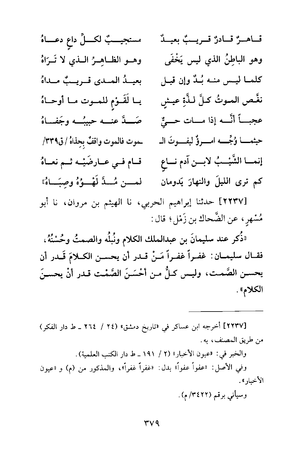 2237 - حَدَّثَنَا إبْرَاهِيمُ الْحَرْبِيُّ، نَا الْهَيْثَمُ بْنُ مَرْوَانَ، نا أَبُو مُسْهِرٍ عَنِ الضَّحَّاكِ بْنِ زَمْلٍ؛ قَالَ: ذُكِرَ عِنْدَ سُلَيْمَانَ بْنِ عَبْدِ الْمَلِكِ الْكَلامَ وَنُبْلُهُ وَالصَّمْتُ وَحُسْنُهُ، فَقَالَ سُلَيْمَانُ: غَفْرًا غَفْرًا، مَنْ قَدَرَ أَنْ يُحْسِنَ الْكَلامَ قَدَرَ أَنْ يُحْسِنَ الصَّمْتَ، وَلَيْسَ كُلُّ مَنْ أَحْسَنَ الصَّمْتَ قَدَرَ أَنْ يُحْسِنَ الْكَلامَ.