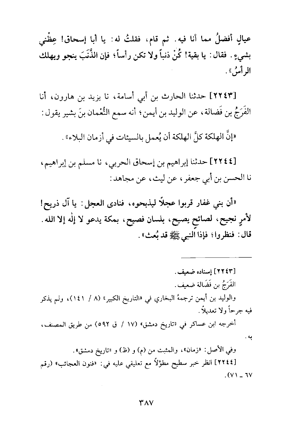 2243 - حَدَّثَنَا الْحَارِثُ بْنُ أَبِي أُسَامَةَ، نَا يَزِيدُ بْنُ هَارُونَ، أنا الْفَرَجُ بْنُ فَضَالَةَ، عَنِ الْوَلِيدِ بْنِ أَيْمَنَ؛ أَنَّهُ سَمِعَ النُّعْمَانَ بْنَ بَشِيرٍ يَقُولُ: إِنَّ الْهَلَكَةَ كُلَّ الْهَلَكَةِ أَنْ يُعْمَلَ بِالسَّيِّئَاتِ فِي أَزْمَانِ الْبَلاءِ