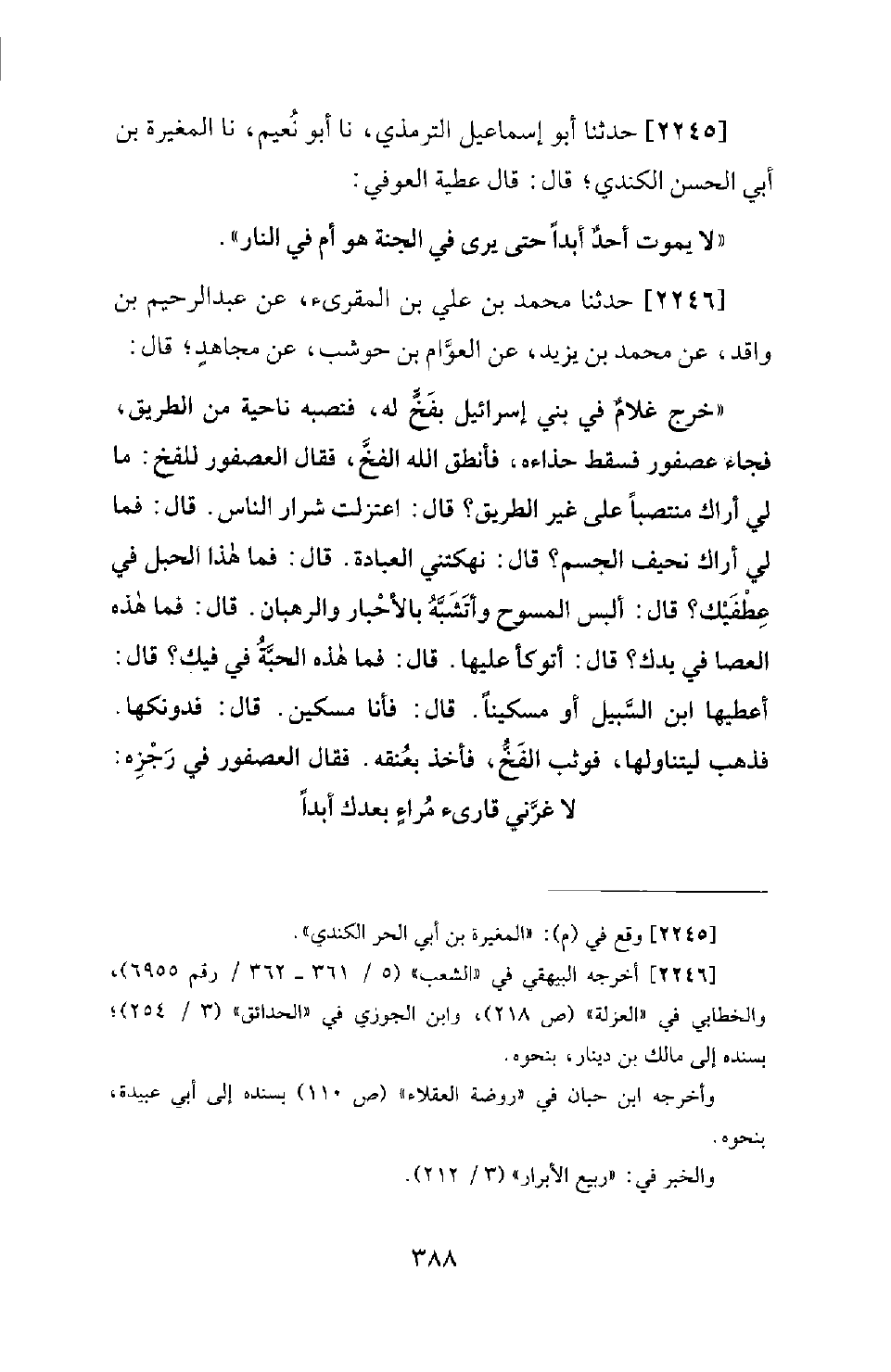 2245 - حَدَّثَنَا أَبُو إِسْمَاعِيلَ التِّرْمِذِيُّ، نَا أَبُو نُعَيْمٍ، نَا الْمُغِيرَةُ بْنُ أَبِي الْحَسَنِ الْكِنْدِيُّ؛ قَالَ: قَالَ عَطِيَّةُ الْعَوْفِيُّ: لا يَمُوتُ أحدا أَبَدًا حَتَّى يَرَى فِي الْجَنَّةِ هُوَ أَمْ فِي النَّارِ.