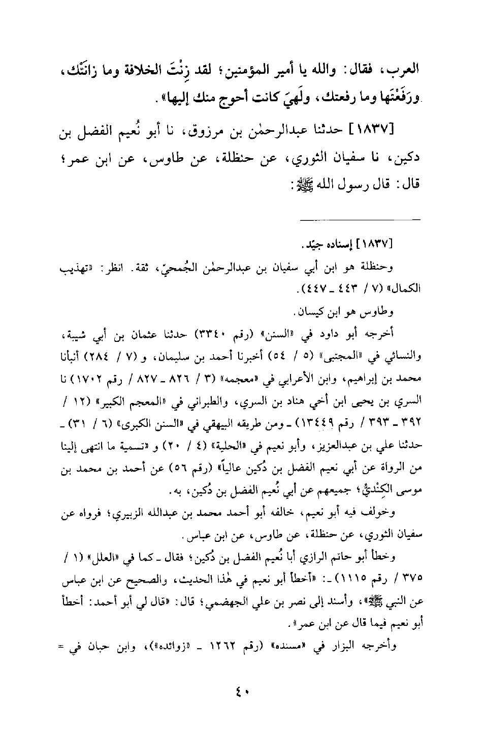 1837 - حَدَّثَنَا عَبْدُ الرَّحْمَنِ بْنُ مَرْزُوقٍ، نَا أَبُو نُعَيْمٍ الْفَضْلُ بْنُ دُكَيْنٍ، نَا سُفْيَانُ الثَّوْرِيُّ، عَنْ حَنْظَلَةَ، عَنْ طَاوُسٍ، عَنِ ابْنِ عُمَرَ؛ قَالَ: قَالَ رَسُولُ اللهِ -[42]- صَلَّى اللَّهُ عَلَيْهِ وَسَلَّمَ: «الْمِكْيَالُ مِكْيَالُ أَهْلِ الْمَدِينَةِ، وَالْوَزْنُ وَزْنُ أَهْلِ مَكَّةَ»