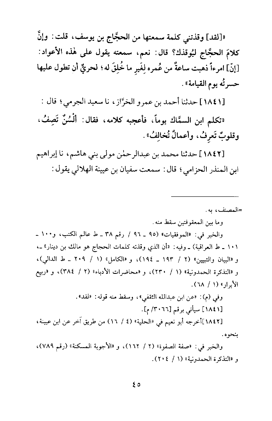 1841 - حَدَّثَنَا أَحْمَدُ بْنُ عَمْرٍو الْخَرَّازُ، نَا سَعِيدٌ الْجَرْمِيُّ؛ قَالَ: تَكَلَّمَ ابْنُ السَّمَّاكِ يَوْمًا، فَأَعْجَبَهُ كَلَامُهُ، فَقَالَ: أَلْسُنٌ تَصِفُ، وَقُلُوبٌ تَعرِفُ، وَأَعْمَالٌ تُخَالِفُ.