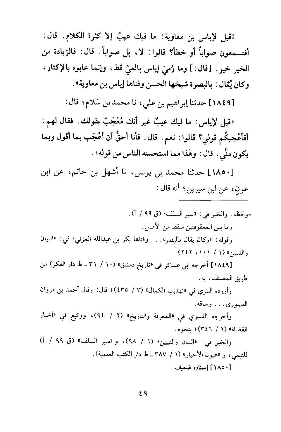 1849 - حَدَّثَنَا إِبْرَاهِيمُ بْنُ عَلِيٍّ، نَا مُحَمَّدُ بْنُ سَلامٍ؛ قَالَ: قِيلَ لِإِيَاسٍ: مَا فِيكَ عَيْبٌ غَيْرَ أَنَّكَ مُعْجَبٌ بِقَوْلِكَ. فَقَالَ لَهُمْ: أَفَأَعْجَبَكُمْ قَوْلِي؟ قَالُوا: نَعَمْ. قَالَ: فَأَنَا أَحَقُّ أَنْ أُعْجَبَ بِمَا أَقُولُ وَبِمَا يَكُونُ مِنِّي. قَالَ: وَهَذَا مِمَّا اسْتَحْسَنَهُ النَّاسُ مِنْ قَوْلِهِ.