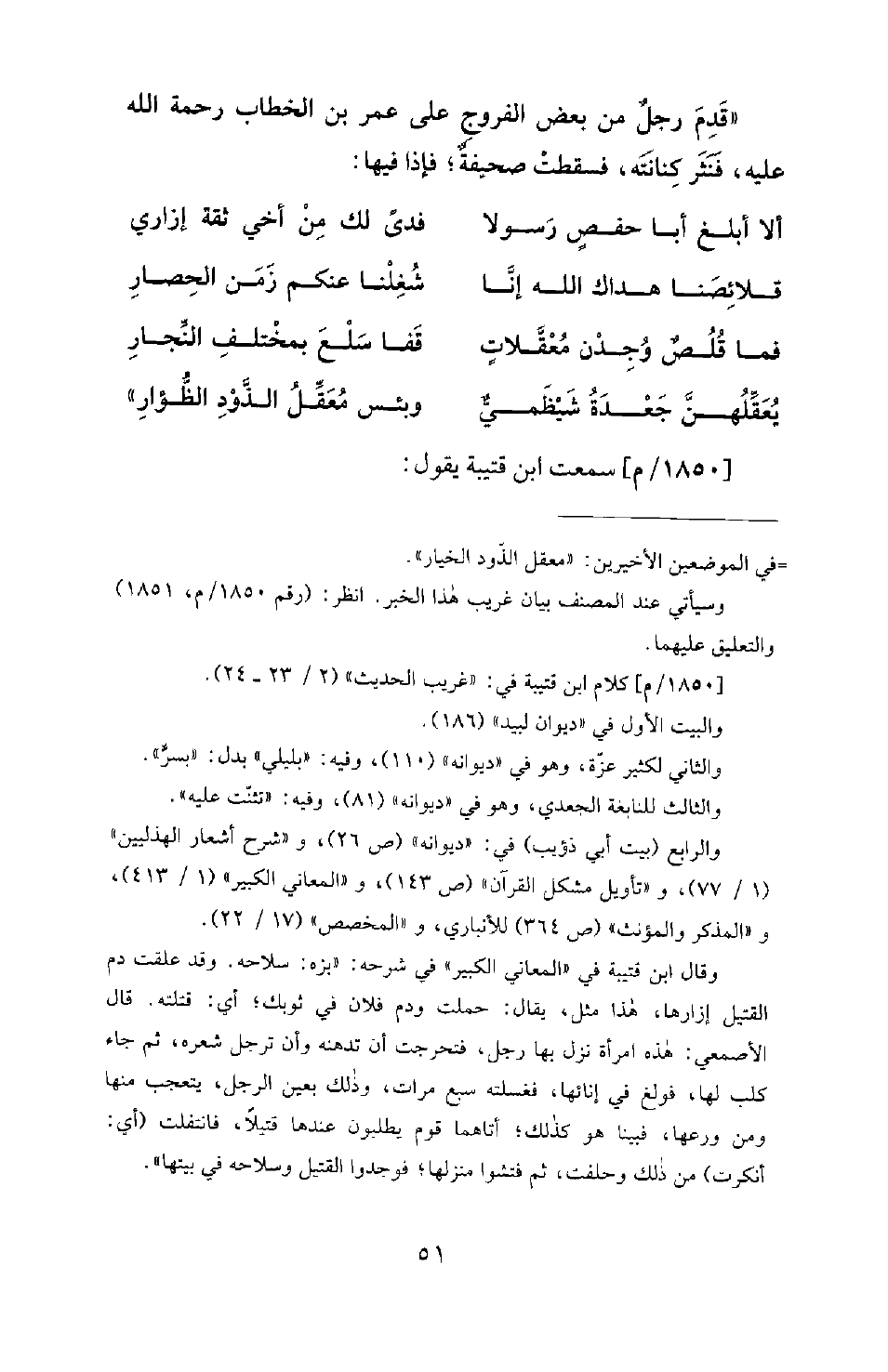 1850 - / م - سَمِعْتُ ابْنَ قُتَيْبَةَ يَقُولُ: -[52]- تَفْسِيرُ هَذَا الْحَدِيثُ؛ قَالَ: الفُرُوجُ: الثُّغُورُ، وَاحِدَهَا فَرْجٌ، قَالَ لَبِيدٌ: