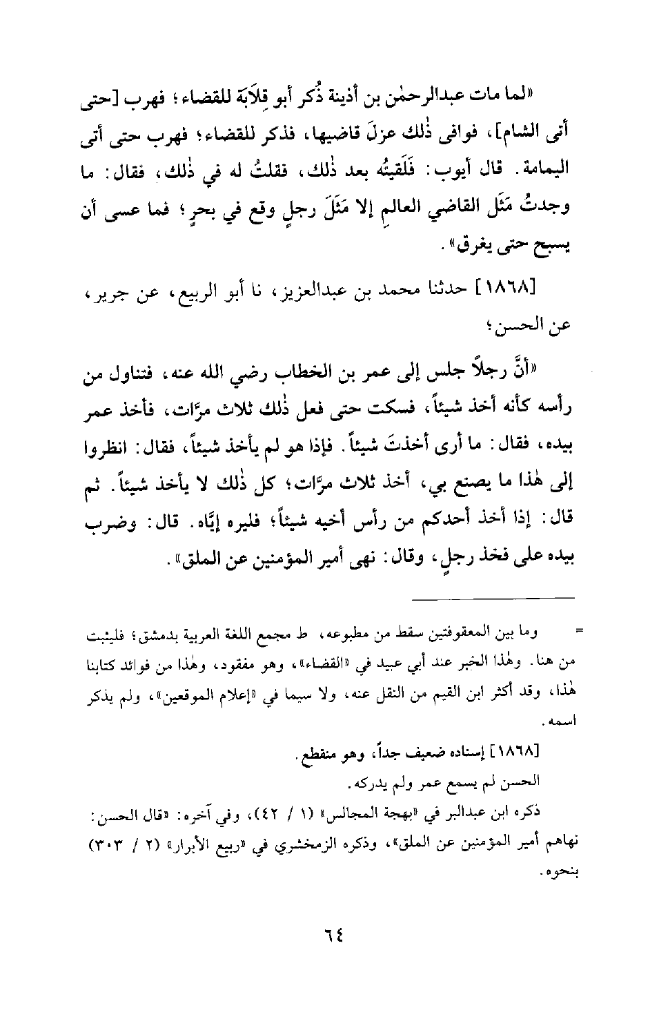 1868 - حَدَّثَنَا مُحَمَّدُ بْنُ عَبْدِ الْعَزِيزِ، نَا أَبُو الرَّبِيعِ، عَنْ جَرِيرٍ، عَنِ الْحَسَنِ: أَنَّ رَجُلًا جَلَسَ إِلَى عُمَرَ بْنِ الْخَطَّابِ رَضِيَ اللهُ عَنْهُ، فَتَنَاوَلَ مِنْ رَأْسِهِ كَأَنَّهُ أَخَذَ شَيْئًا، فَسَكَتَ حَتَّى فَعَلَ ذَلِكَ ثَلَاثَ مَرَّاتٍ، فَأَخَذَ عُمَرُ بِيَدِهِ، فَقَالَ: مَا أَرَى أَخَذْتَ شَيْئًا. فَإِذَا هُوَ لَمْ يَأْخُذْ شَيْئًا، فَقَالَ: انْظُرُوا إِلَى هَذَا مَا يَصْنَعُ بِي أَخَذَ ثَلَاثَ مَرَّاتٍ؛ كُلُّ ذَلِكَ لَا يَأْخُذُ شَيْئًا. ثُمَّ قَالَ: إِذَا أَخَذَ أَحَدُكُمْ مِنْ رَأْسِ أَخِيهِ شَيْئًا؛ فَلْيُرِهِ إِيَّاهُ. قَالَ: وَضَرَبَ بِيَدِهِ عَلَى فَخْذِ رَجُلٍ، وَقَالَ: نَهَى أَمِيرُ الْمُؤْمِنِينَ عَنِ الْمَلَقِ