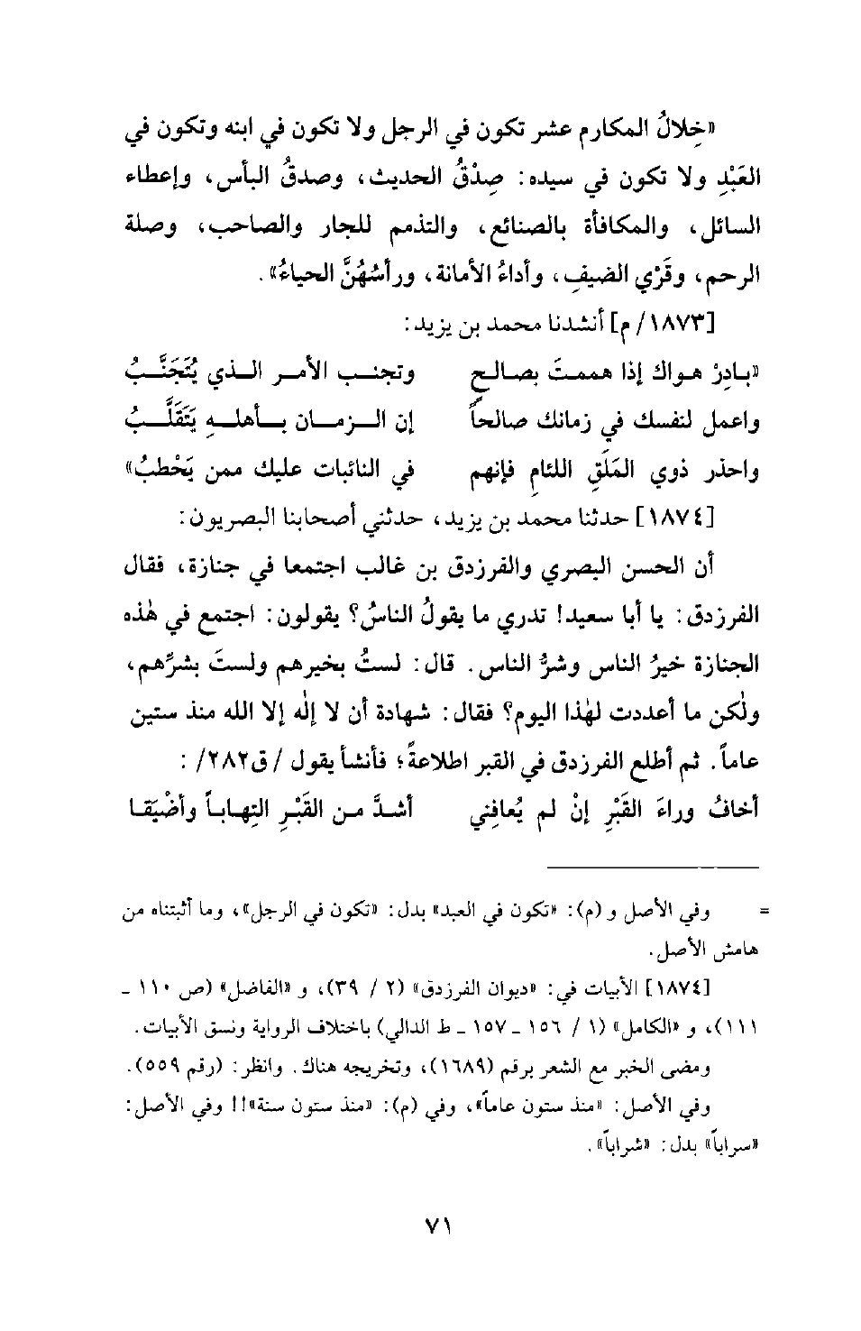 1874 - حَدَّثَنَا مُحَمَّدُ بْنُ يَزِيدَ، حَدَّثَنِي أَصْحَابُنَا الْبَصْرِيُّونَ: أَنَّ الْحَسَنَ الْبَصْرِيَّ وَالْفَرَزْدَقَ بْنَ غَالِبٍ اجْتَمَعَا فِي جَنَازَةٍ، فَقَالَ الفرزدق: ياأبا سَعِيدٍ! تَدْرِي ما يَقُولُ النَّاسُ؟ يَقُولُونَ: اجْتَمَعَ فِي هَذِهِ الجَّنَازَةِ خَيْرُ النَّاسِ وَشَرُّ النَّاسِ. قَالَ: لَسْتُ بِخَيْرِهِمْ وَلَسْتَ بِشَرِّهِمْ، وَلَكِنْ مَا أَعْدَدْتَ لِهَذَا الْيَوْمِ؟ فقال: شهادة أَنَّ لَا إِلَهَ إِلَّا اللهَ مُنْذُ سِتِّينَ عَامًا. ثُمَّ اطلع الْفَرَزْدَقُ فِي الْقَبْرِ اطِّلَاعَةً؛ فَأَنْشَأَ يَقُولُ: (أَخَافُ وَرَاءَ الْقَبْرِ إن لم يعافني ... أشد من القبر التهابا وأضيقا -[72]-)