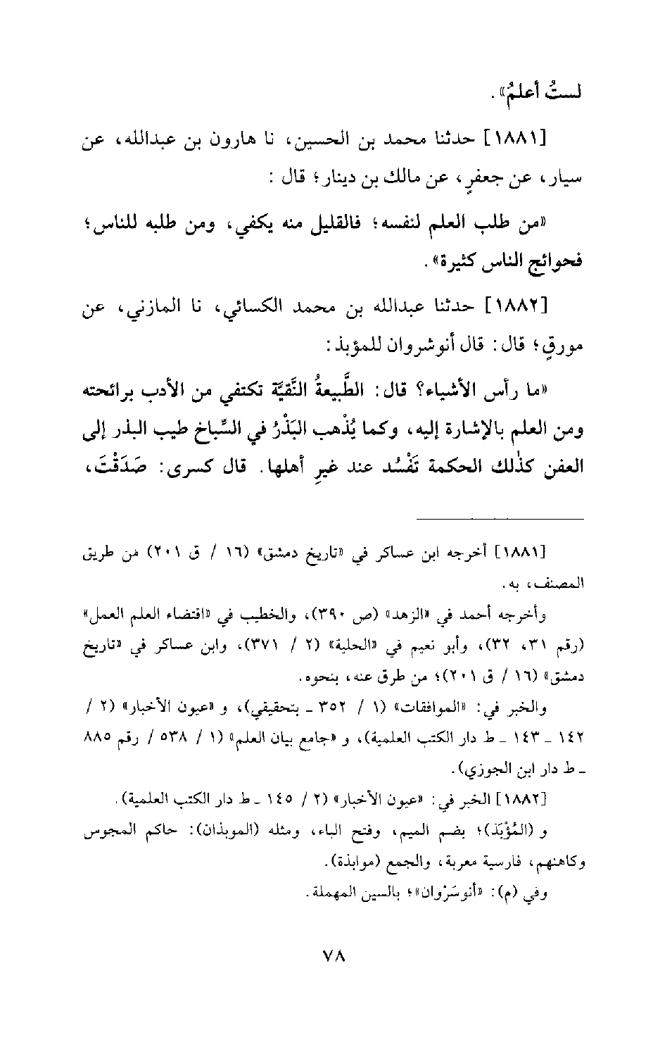 1882 - حَدَّثَنَا عَبْدُ اللهِ بْنُ مُحَمَّدٍ الْكِسَائِيُّ، نَا الْمَازِنِيُّ، عَنْ مُوَرِّقٍ؛ قَالَ: قال أنو شروان لِلْمُؤبذِ: مَا رَأْسُ الْأَشْيَاءِ؟ قَالَ: الطَّبِيعَةُ النَّقِيَّةُ تَكْتَفِي مِنَ الْأَدَبِ بِرَائِحَتِهِ وَمِنَ الْعِلْمِ بِالْإِشَارَةِ إِلَيْهِ، وَكَمَا يُذْهَبُ الْبَذْرُ فِي السِّبَاخِ طَيِّبَ الْبَذْرِ إِلَى الْعَفَنِ كَذَلِكَ الْحِكْمَةُ تُفْسَدُ عِنْدَ غَيْرِ أَهْلِهَا. قَالَ كِسْرَى: صَدَقْتَ، -[79]- وَبِحَقٍّ قَلَّدْنَاكَ مَا قَلَّدْنَاكَ.