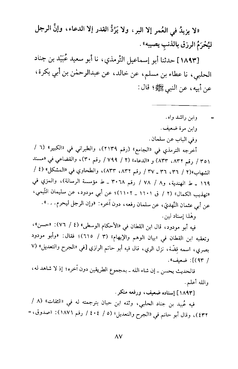 1893 - حَدَّثَنَا أَبُو إِسْمَاعِيلَ التِّرْمِذِيُّ، نَا أَبُو سَعِيدٍ عُبَيْدُ بْنُ جَنَّادٍ الْحَلَبِيُّ، نَا عَطَاءُ بْنُ مُسْلِمٍ، عَنْ خَالِدٍ، عَنْ عَبْدِ الرَّحْمَنِ بْنِ أَبِي بَكَرَةَ، عَنْ أَبِيهِ، عَنِ النَّبِيِّ صَلَّى اللَّهُ عَلَيْهِ وَسَلَّمَ؛ قَالَ -[90]-: «اغْدُ عَالِمًا أَوْ مُتَعَلِّمًا أَوْ مُسْتَمِعًا أَوْ مُحِبًّا، وَلَا تَكُنِ الْخَامِسَ فَتَهْلَكَ» . قَالَ عَطَاءٌ: فَقَالَ لِي مِسْعَرٌ: يَا عَطَاءُ! هَذِهِ خَامِسَةٌ زَادَنَا اللهُ فِي هَذَا الْحَدِيثِ لَمْ تَكُنْ فِي أَيْدِينَا، إِنَّمَا كَانَ فِي أَيْدِينَا: عَالِمًا أَوْ مُتَعَلِّمًا أَوْ مُسْتَمِعًا، وَلَا تَكُنِ الرَّابِعَ فَتَهْلَكَ. يَا عَطَاءُ! وَيْلٌ لِمَنْ لَمْ يَكُنْ فِيهِ وَاحِدَةٌ مِنْ هَذِهِ
