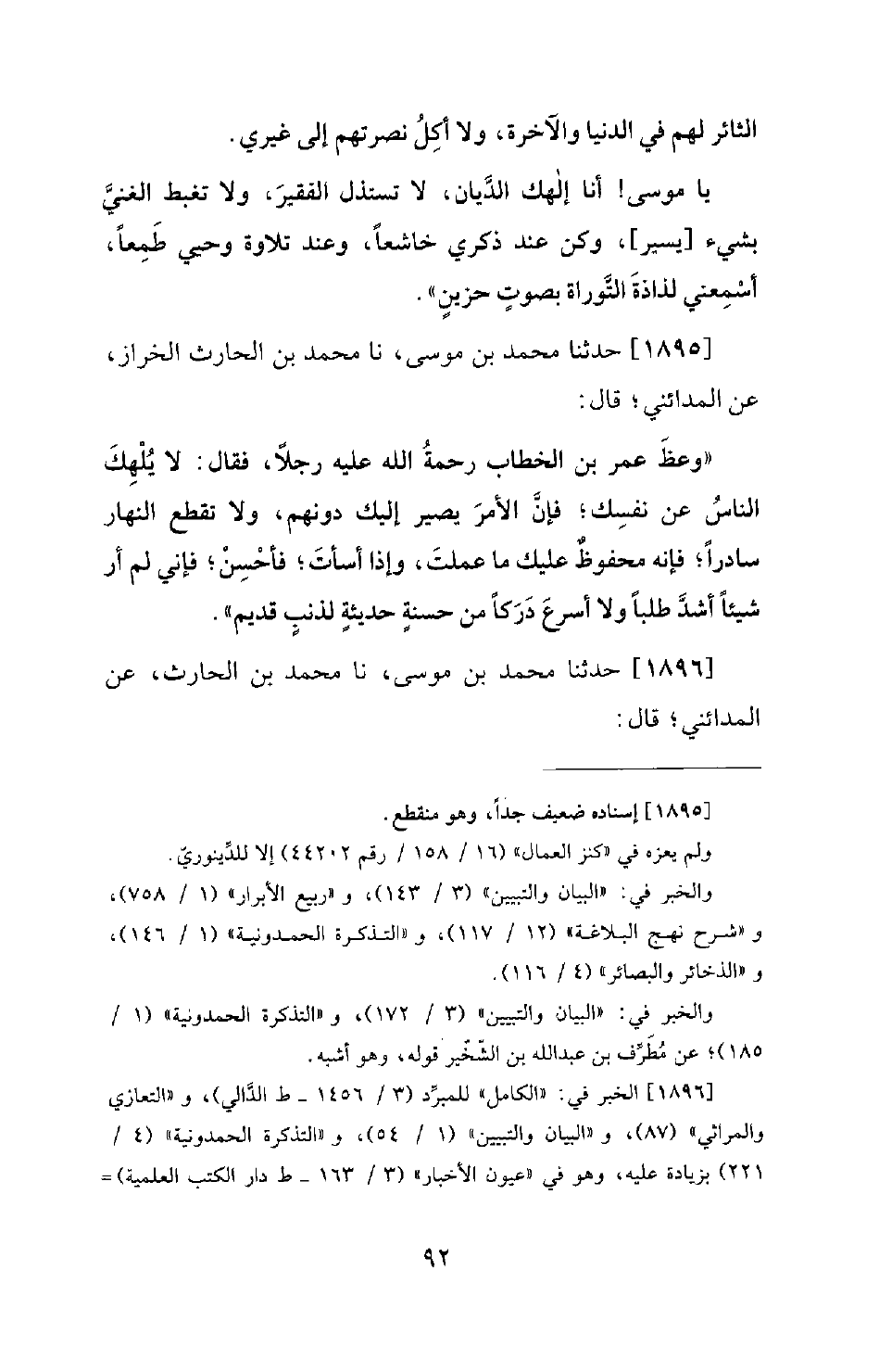 1895 - حَدَّثَنَا مُحَمَّدُ بْنُ مُوسَى، نَا مُحَمَّدُ بْنُ الْحَارِثِ الْخَرَّازُ، عَنِ الْمَدَائِنِيِّ؛ قَالَ: وَعَظَ عُمَرُ بْنُ الْخَطَّابِ رَحْمَةُ اللهِ عَلَيْهِ رَجُلًا، فَقَالَ: لَا يُلْهِكَ النَّاسُ عَنْ نَفْسِكَ؛ فَإِنَّ الْأَمْرَ يَصِيرُ إِلَيْكَ دُونَهُمْ، وَلَا تَقْطَعِ النَّهَارَ سَادِرًا؛ فَإِنَّهُ مَحْفُوظٌ عَلَيْكَ مَا عَمِلْتَ، وَإِذَا أَسَأْتَ؛ فَأَحْسِنْ؛ فَإِنِّي لَمْ أَرَ شَيْئًا أَشَدَّ طَلَبًا وَلَا أَسْرَعَ دَرَكًا مِنْ حَسَنَةٍ حَدِيثَةٍ لِذَنْبٍ قَدِيمٍ