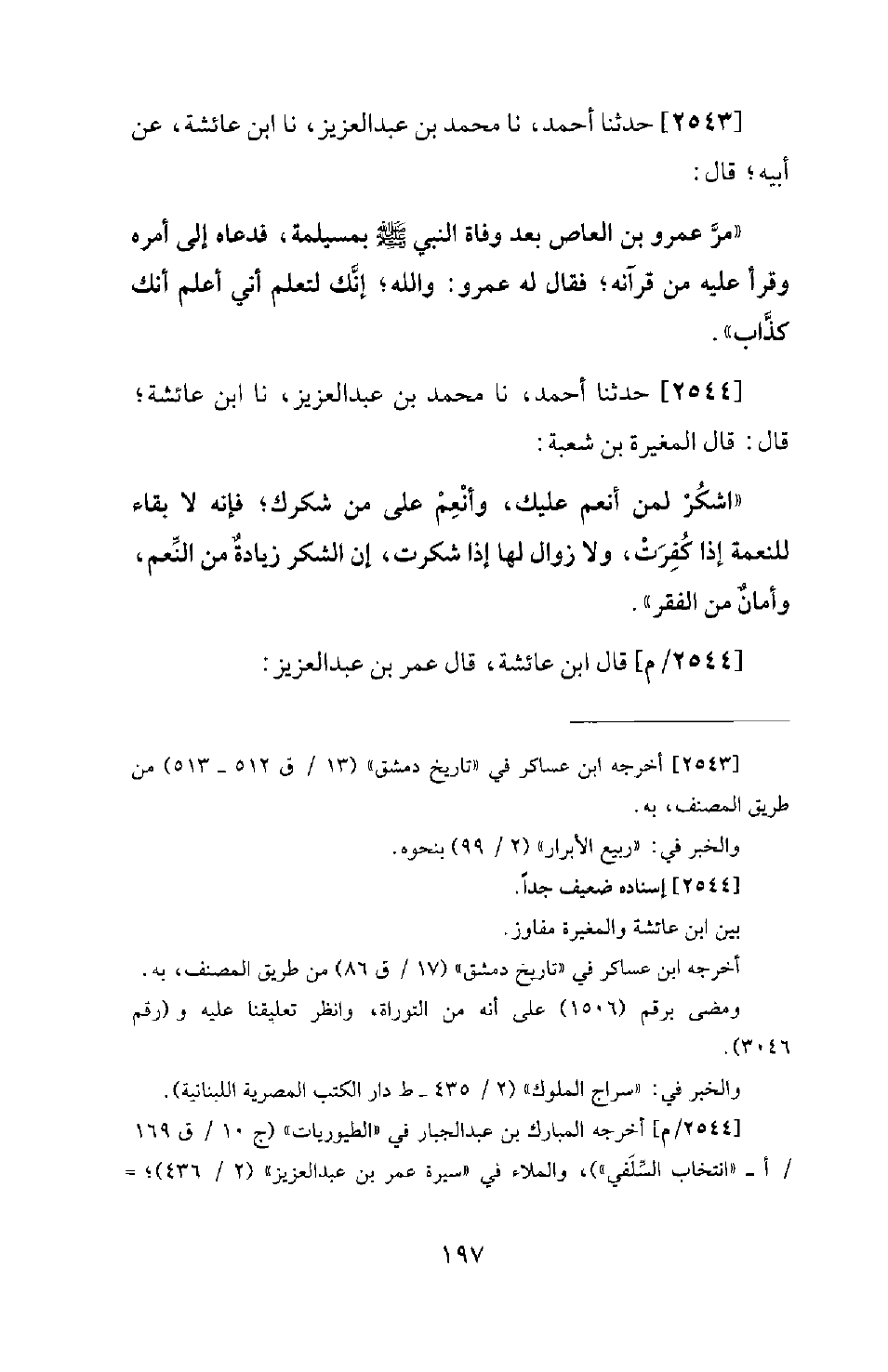 2543 - حَدَّثَنَا أَحْمَدُ، نا مُحَمَّدُ بْنُ عَبْدِ الْعَزِيزِ: نا ابْنُ عَائِشَةَ، عَنْ أَبِيهِ؛ قَالَ: مَرَّ عَمْرُو بْنُ الْعَاصِ بَعْدَ وَفَاةِ النَّبِيِّ صَلَّى اللَّهُ عَلَيْهِ وَسَلَّمَ بِمُسَيْلَمَةَ، فَدَعَاهُ إِلَى أَمْرِهِ وَقَرَأَ عَلَيْهِ مِنْ قُرْآنِهِ؛ فَقَالَ لَهُ عَمْرٌو: وَاللهِ! إِنَّكَ لَتَعْلَمُ أَنِّي أَعْلَمُ أَنَّكَ كَذَّابٌ.