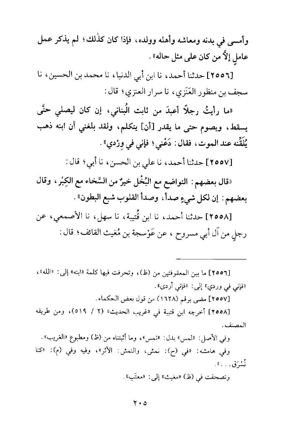 2556 - حَدَّثَنَا أَحْمَدُ، نا ابْنُ أَبِي الدُّنْيَا، نا مُحَمَّدُ بْنُ الْحُسَيْنِ، نا سَجْفُ بْنُ مَنْظُورٍ الْعَنْزِيُّ، نا سِرَارٌ الْعَنْزِيُّ؛ قَالَ: مَا رَأَيْتُ رَجُلا أَعْبَدَ مِنْ ثَابِتٍ الْبُنَانِيِّ، إِنْ كَانَ لَيُصَلِّي حَتَّى يَسْقُطَ، وَيَصُومُ حَتَّى مَا يَقْدِرُ أَنْ يَتَكَلَّمَ، وَلَقَدْ بَلَغَنِي أَنَّ ابْنَهُ ذَهَبَ يُلَقِّنَهُ عِنْدَ الْمَوْتِ، فَقَالَ: دَعْنِي؛ فَإِنِّي فِي وِرْدِي.