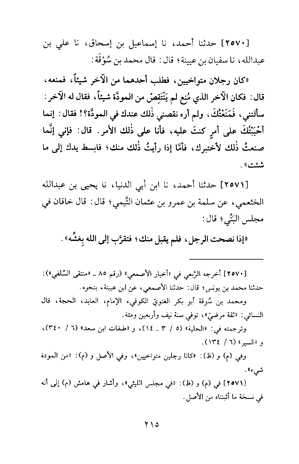 2570 - حَدَّثَنَا أَحْمَدُ، نا إِسْمَاعِيلُ بْنُ إِسْحَاقَ، نا عَلِيُّ بْنُ عَبْدِ اللهِ، نا سُفْيَانُ بْنُ عُيَيْنَةَ؛ قَالَ: قَالَ مُحَمَّدُ بْنُ سُوقَةَ: كَانَ رَجُلانِ مُتَوَاخِيَيْنِ، فَطَلَبَ أَحَدُهُمَا مِنَ الآخَرِ شَيْئًا، فَمَنَعَهُ، قَالَ: فَكَانَ الآخَرُ الَّذِي مُنِعَ لَمْ يَنْتَقِصْ مِنَ الْمَوَدَّةِ شَيْئًا، فَقَالَ لَهُ الآخَرُ: سَأَلْتَنِي، فَمَنَعْتُكَ، وَلَمْ أَرَهُ نَقَصَنِي ذَلِكَ عِنْدَكَ فِي الْمَوَدَّةِ؟ ! فَقَالَ: إِنَّمَا أَحْبَبْتُكَ عَلَى أَمْرٍ كُنْتَ عَلَيْهِ، فَأَنَا عَلَى ذَلِكَ الأَمْرِ. قَالَ: فَإِنِّي إِنَّمَا صَنَعْتُ ذَلِكَ لأَخْتَبِرَكَ، فَأَمَّا إِذَا رَأَيْتُ ذَلِكَ مِنْكَ؛ فَابْسُطْ يَدَكَ إِلَى مَا شِئْتَ.