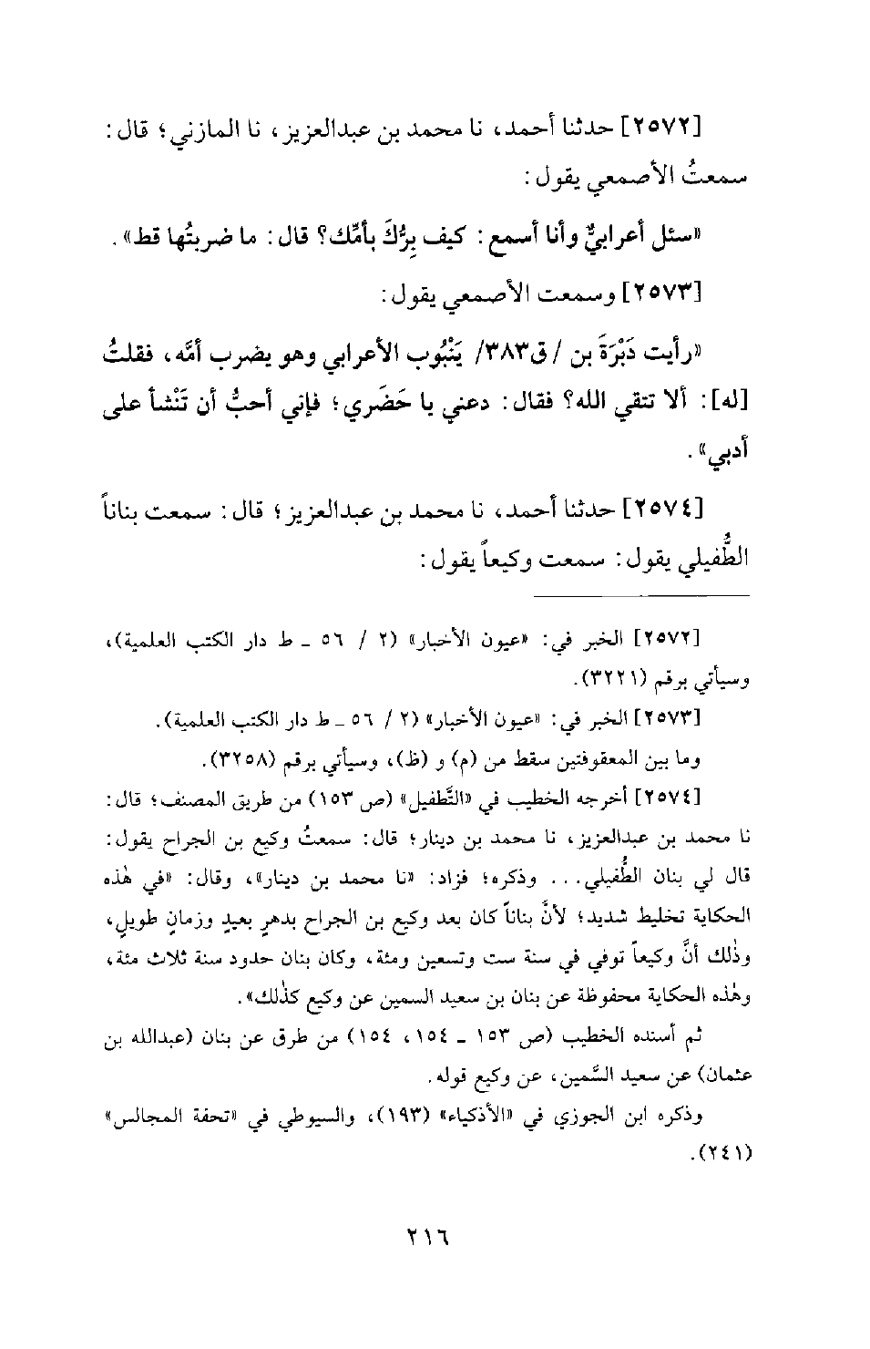 2572 - حَدَّثَنَا أَحْمَدُ، نا مُحَمَّدُ بْنُ عَبْدِ الْعَزِيزِ، نا الْمَازِنِيُّ؛ قَالَ: سَمِعْتُ الأَصْمَعِيَّ يَقُولُ: سُئِلَ أَعْرَابِيٌ وَأَنَا أَسْمَعُ، كَيْفَ بِرُّكَ بِأُمِّكَ؟ قَالَ: مَا ضَرَبْتُهَا قَطُّ.