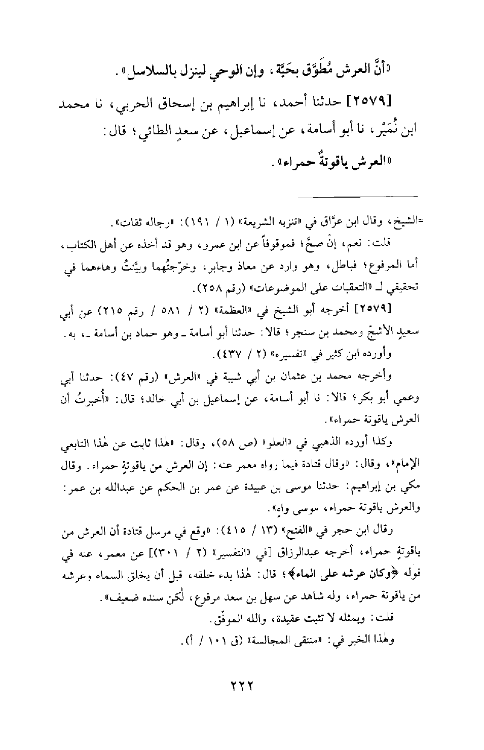 2579 - حَدَّثَنَا أَحْمَدُ، نا إِبْرَاهِيمُ بْنُ إِسْحَاقَ الْحَرْبِيُّ، نا مُحَمَّدُ بْنُ نُمَيْرٍ، نا أَبُو أُسَامَةَ، عَنْ إِسْمَاعِيلَ، عَنْ سَعْدٍ الطَّائِيِّ؛ قَالَ: الْعَرْشُ يَاقُوتَةٌ حَمْرَاءُ.
