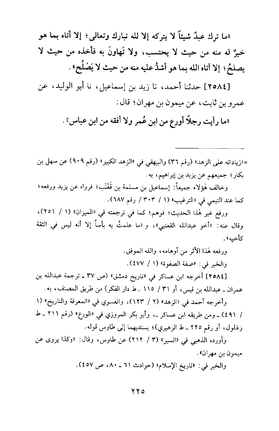 2584 - حَدَّثَنَا أَحْمَدُ، نا زَيْدُ بْنُ إِسْمَاعِيلَ، نا أَبُو الْوَلِيدِ، عَنْ عَمْرِو بْنِ ثَابِتٍ، عَنْ مَيْمُونِ بْنِ مِهْرَانَ؛ قَالَ: مَا رايت رَجُلا أَوْرَعَ مِنَ ابْنِ عُمَرَ، وَلا أَفْقَهَ مِنَ ابْنِ عَبَّاسٍ.