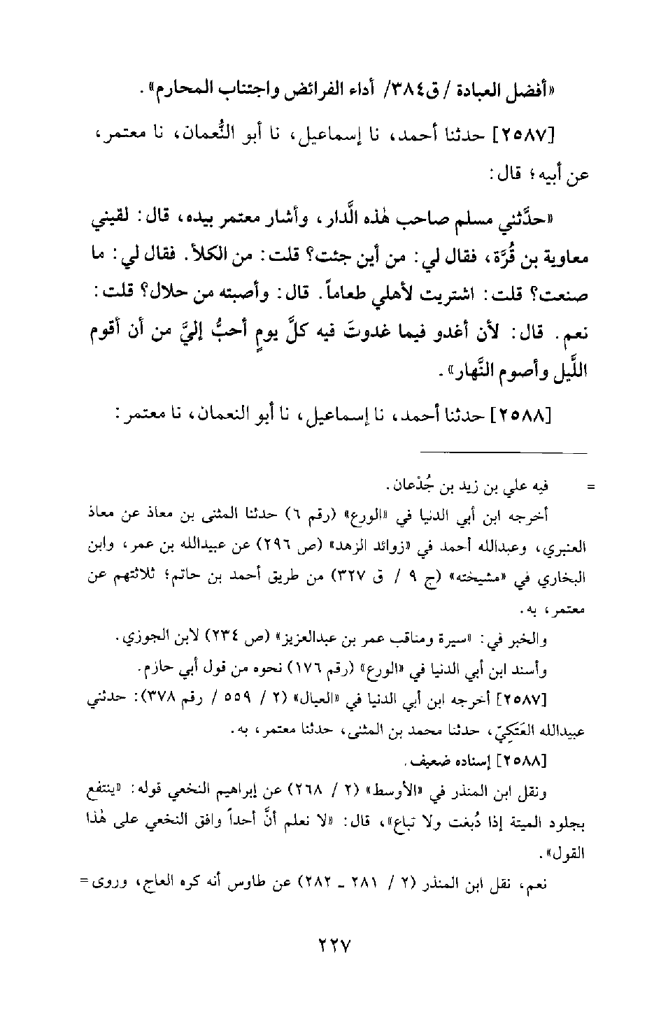 2587 - حَدَّثَنَا أَحْمَدُ، نا إِسْمَاعِيلُ، نا أَبُو النُّعْمَانِ، نا مُعْتَمِرٌ، عَنْ أَبِيهِ؛ قَالَ: حَدَّثَنِي مُسْلِمٌ صَاحِبُ هَذِهِ الدَّارِ، وَأَشَارَ مُعْتَمِرٌ بِيَدِهِ، قَالَ: لَقِيَنِي مُعَاوِيَةُ بْنُ قُرَّةَ، فَقَالَ لِي: مِنْ أَيْنَ جِئْتَ؟ قُلْتُ: مِنَ الْكَلأِ. فَقَالَ لِي: مَا صَنَعْتَ؟ قُلْتَ: اشْتَرَيْتُ لأَهْلِي طَعَامًا. قَالَ: وأصبته من حلال؟ قال: نَعَمْ. قَالَ: لأَنْ أَغْدُوَ فِيمَا غَدَوْتَ فِيهِ كُلَّ يَوْمٍ أَحَبُّ إِلَيَّ مِنْ أَنْ أَقُومَ اللَّيْلَ وَأَصُومَ النَّهَارَ.