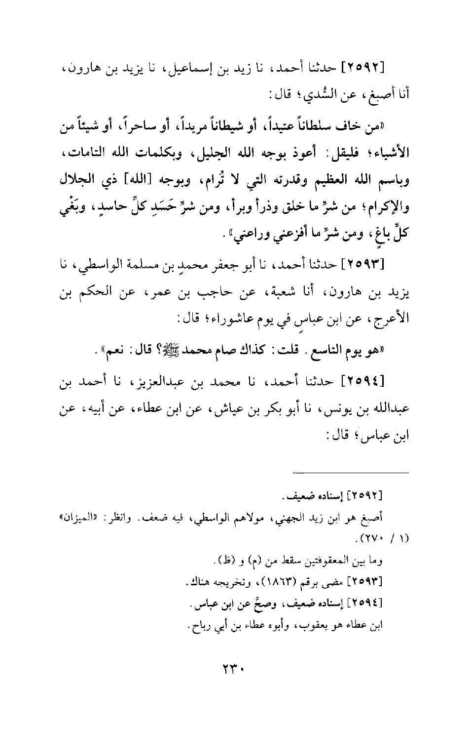 2592 - حَدَّثَنَا أَحْمَدُ، نا زَيْدُ بْنُ إِسْمَاعِيلَ، نا يَزِيدُ بْنُ هَارُونَ، أَنَا أَصْبَغُ، عَنِ السُّدِّيِّ؛ قَالَ: مَنْ خَافَ سُلْطَانًا عَتِيدًا، أَوْ شَيْطَانًا مَرِيدًا، أَوْ سَاحِرًا، أَوْ شَيْئًا مِنَ الأَشْيَاءِ؛ فَلْيَقُلْ أَعُوذُ بِوَجْهِ اللهِ الْجَلِيلِ، وَبِكَلِمَاتِ اللهِ التامات، وباسم اللهِ الْعَظِيمِ وَقُدْرَتِهِ الَّتِي لا تُرَامُ، وَبِوَجْهِ اللهِ ذِي الْجَلالِ وَالإِكْرَامِ؛ مِنْ شَرِّ مَا خَلَقَ وَذَرَأَ وَبَرَأَ، وَمِنْ شَرِّ حَسَدِ كُلِّ حَاسِدٍ، وَبَغْيِ كُلِّ بَاغٍ؛ وَمِنْ شَرِّ مَا أَفْزَعَنِي وَرَاعَنِي