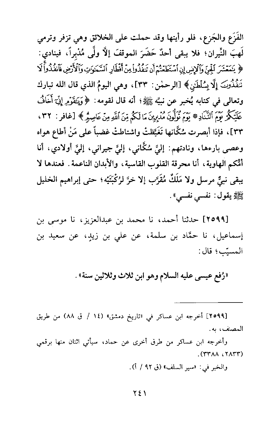 2599 - حَدَّثَنَا أَحْمَدُ، نا مُحَمَّدُ بْنُ عَبْدِ الْعَزِيزِ، نا مُوسَى بْنُ إِسْمَاعِيلَ، نا حَمَّادُ بْنُ سَلَمَةَ، عَنْ عَلِيِّ بْنِ زَيْدٍ، عَنْ سَعِيدِ بْنِ الْمُسَيِّبِ؛ قَالَ: رُفِعَ عِيسَى عَلَيْهِ السَّلامُ وَهُوَ ابْنُ ثَلاثٍ وَثَلاثِينَ سَنَةً.