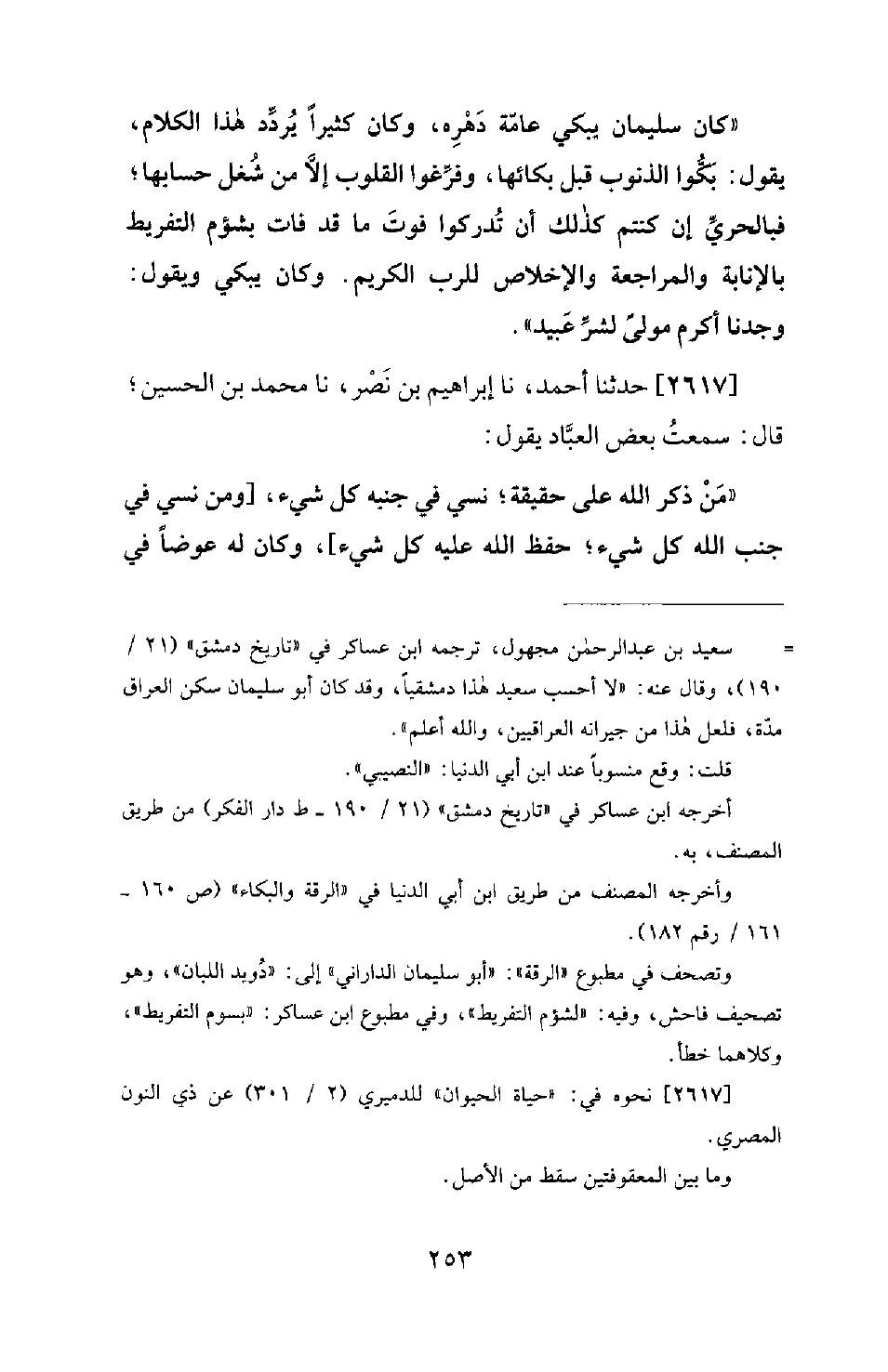 2617 - حَدَّثَنَا أَحْمَدُ، نا إِبْرَاهِيمُ بْنُ نَصْرٍ، نا مُحَمَّدُ بْنُ الْحُسَيْنِ؛ قَالَ: سَمِعْتُ بَعْضَ الْعُبَّادِ يَقُولُ: مَنْ ذَكَرَ اللهَ عَلَى حَقِيقَةٍ؛ نَسِيَ فِي جَنْبِهِ كُلَّ شَيْءٍ، وَمَنْ نَسِيَ فِي جَنْبِ اللهِ كُلَّ شَيْءٍ؛ حَفِظَ اللهُ عَلَيْهِ كُلَّ شَيْءٍ، وَكَانَ لَهُ عِوَضًا فِي -[254]- الدُّنْيَا وَالآخِرَةِ مِنْ كُلِّ شَيْءٍ.